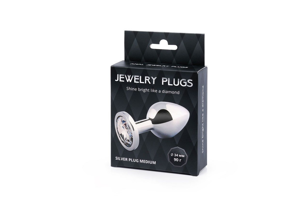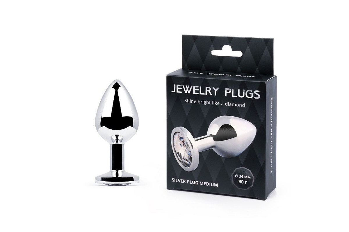 Анальная пробка SILVER PLUG MEDIUM с прозрачным кристаллом - 8,2 см.