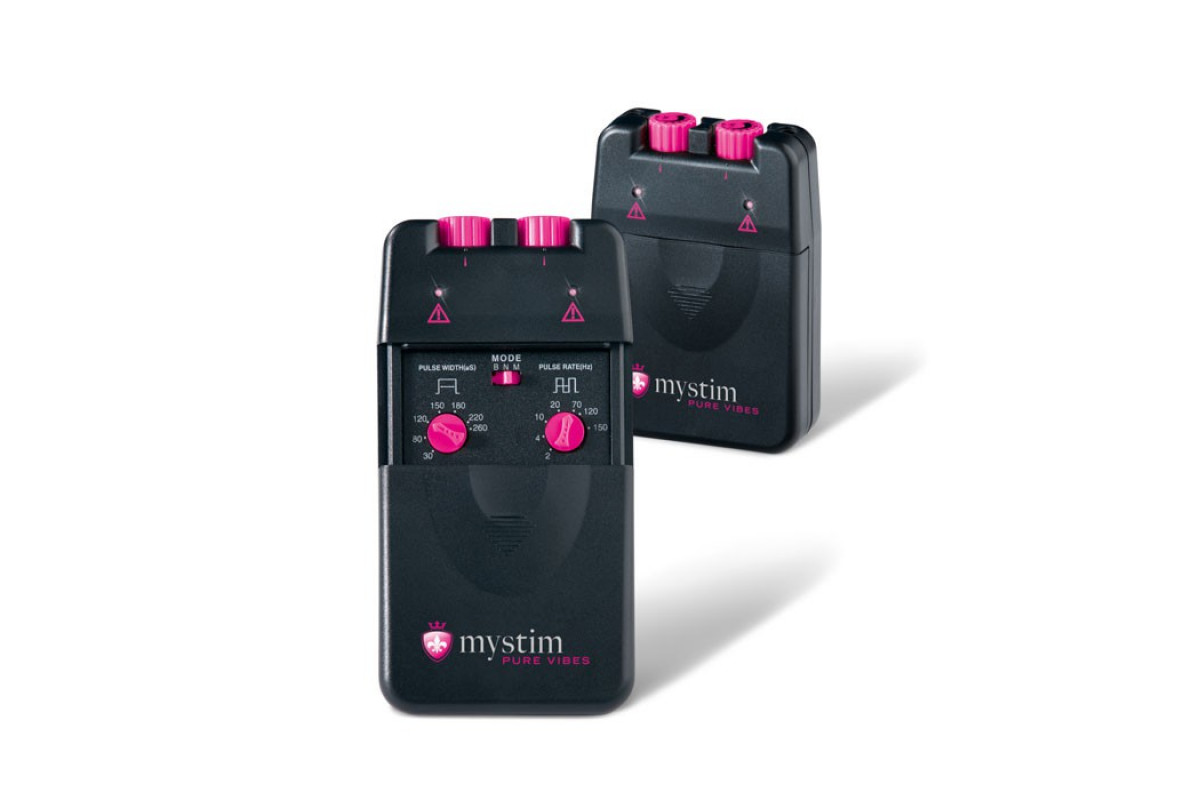 У прибора имеются 2 индивидуально настраиваемых канала для подключения двух электронасадок (для массажа тела или простаты, фаллостимуляции, вагинальной стимуляции). В комплекте: электростимулятор Mystim, 4 самоклеящихся электрода, 2 провода для самоклеящихся электродов, 1 батарея 9 Вольт, инструкция, удобный пластиковый футляр.