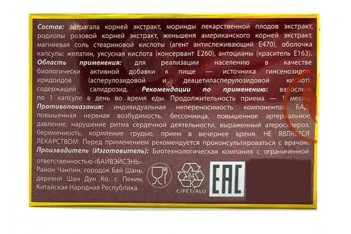 - Состав: трава горянки крупноцветковая, корень моринды лекарственной, корень женьшеня настоящего, желатин.