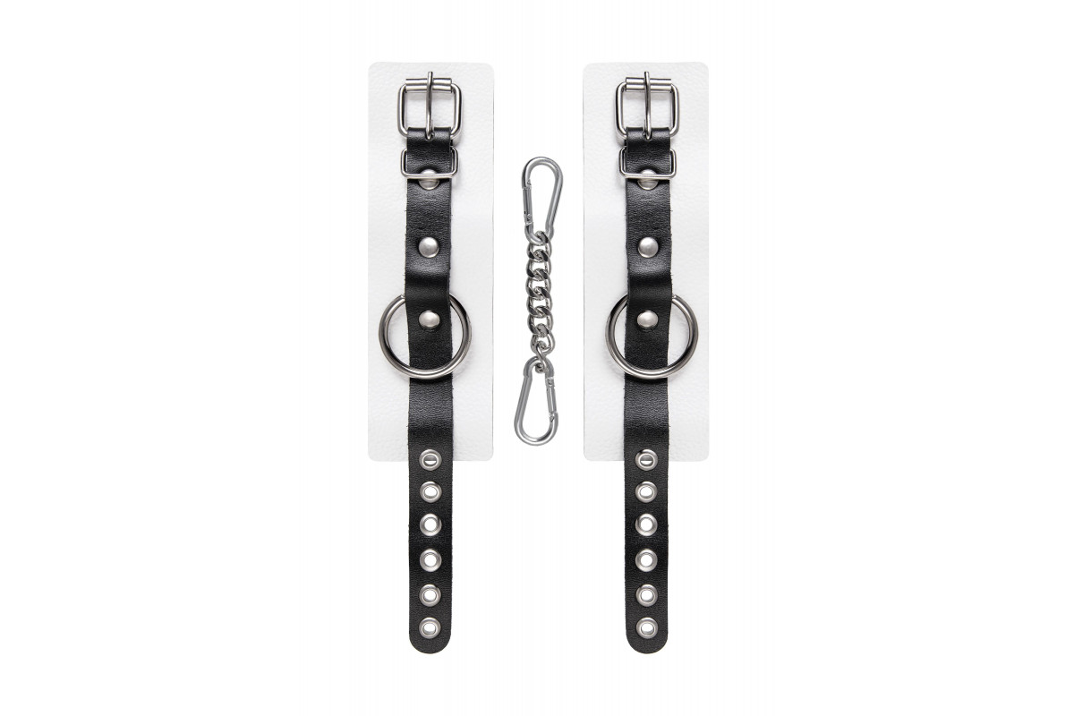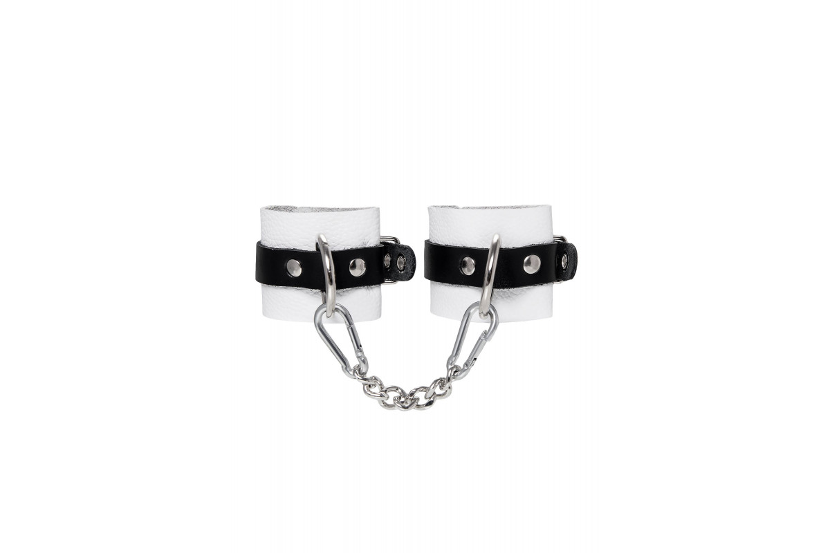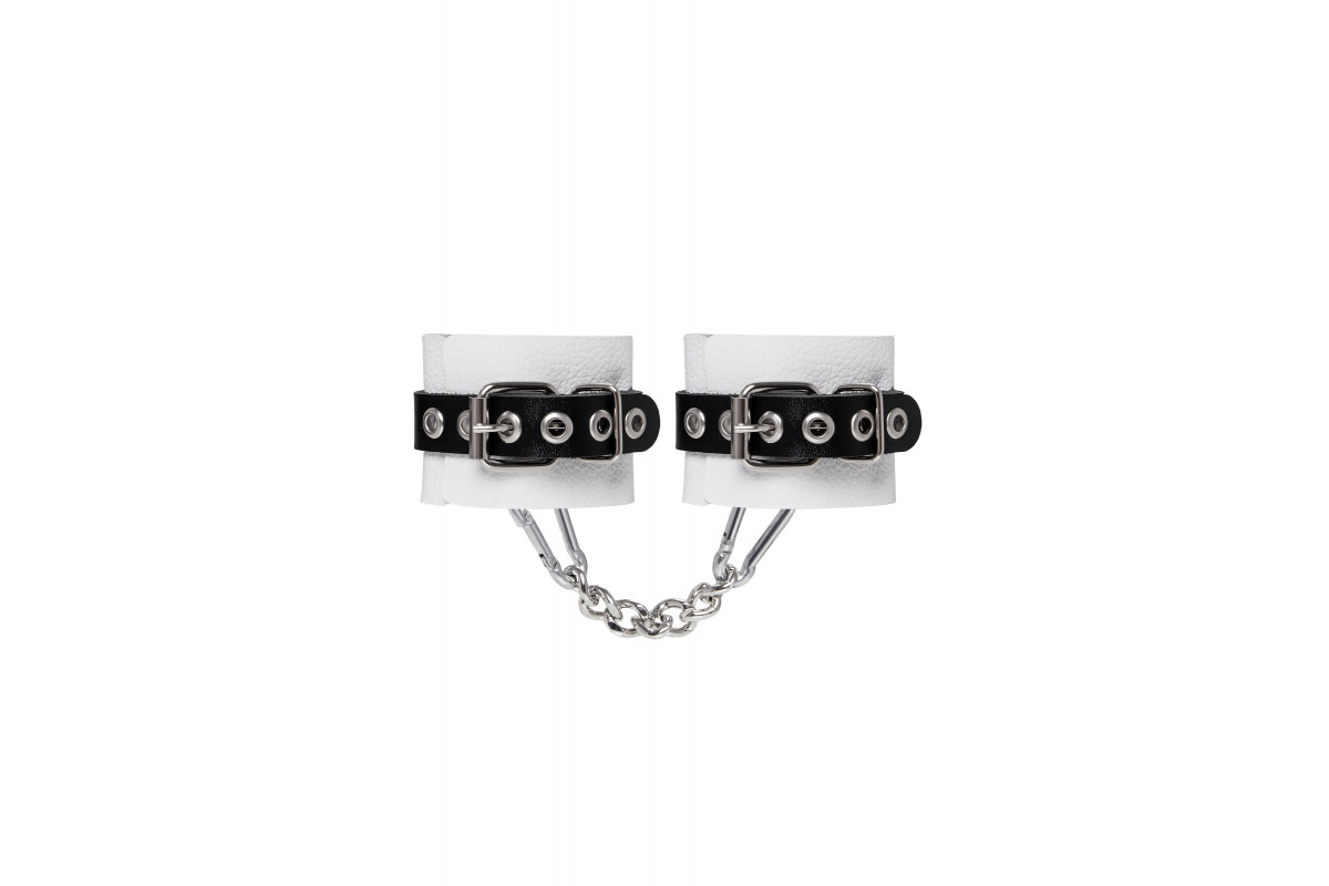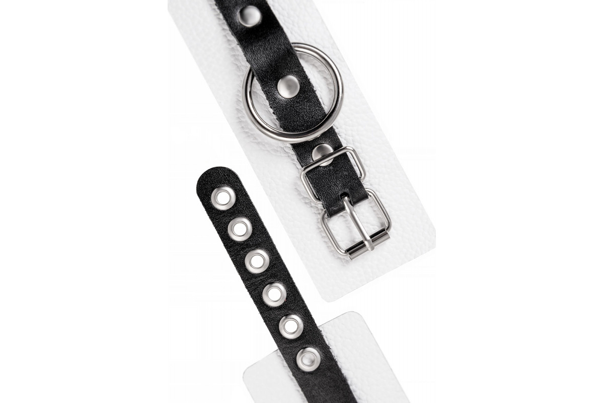Бело-черные кожаные наручники с одним ремешком с люверсами