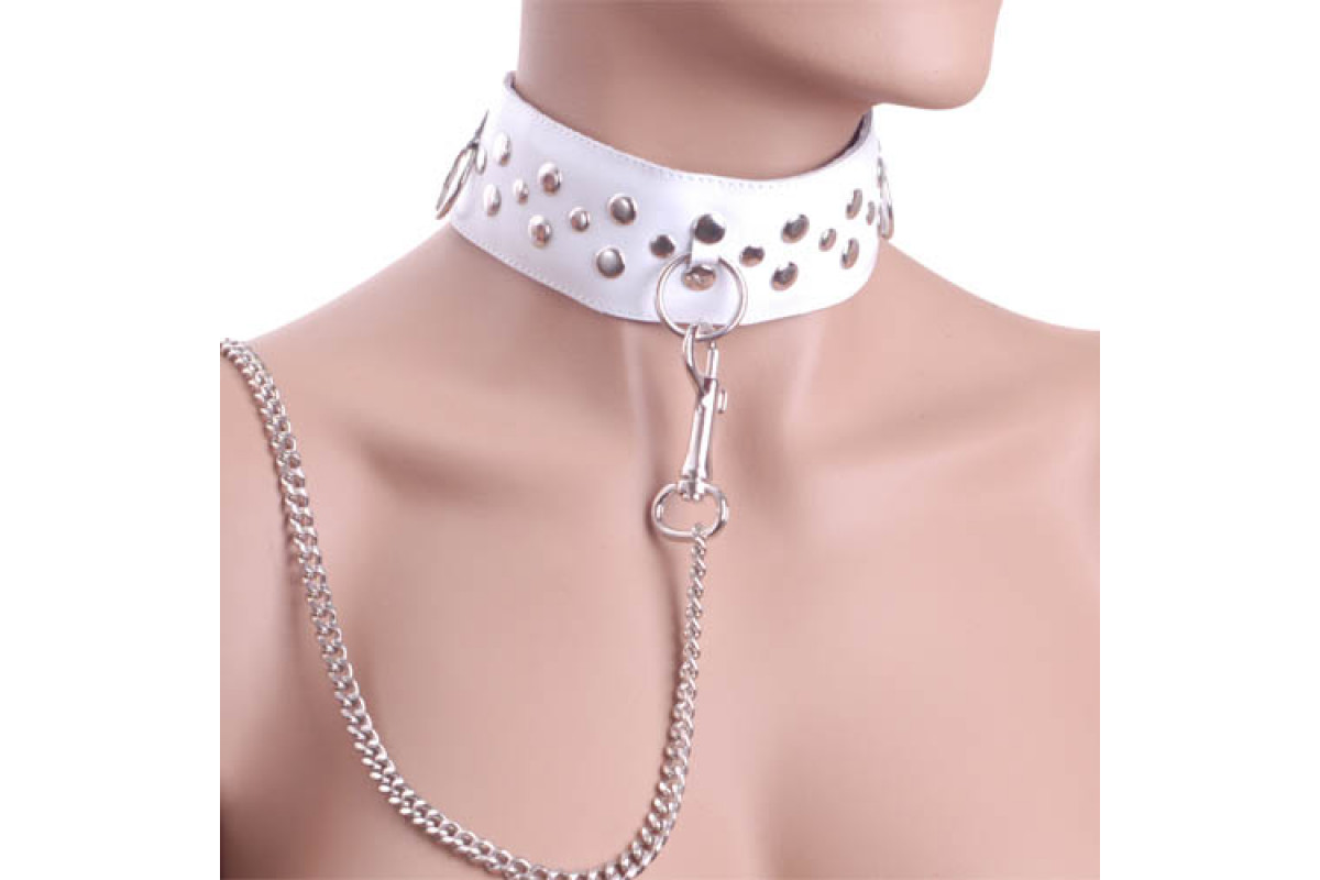 Белый ошейник из кожи с цепочкой-поводком