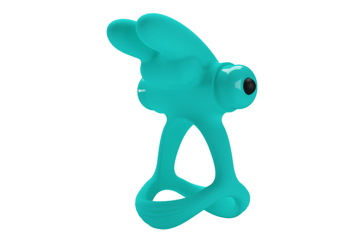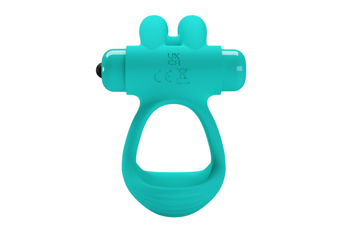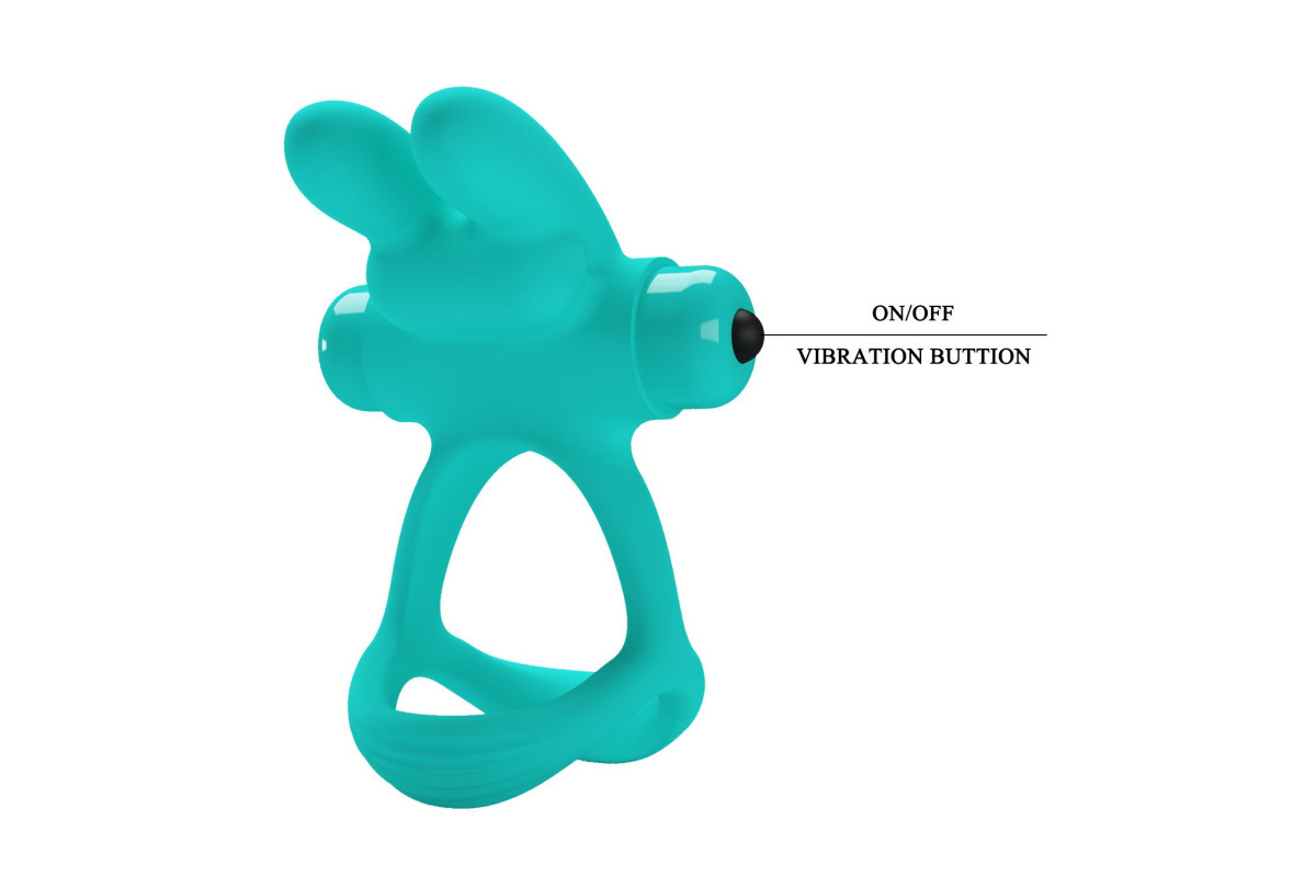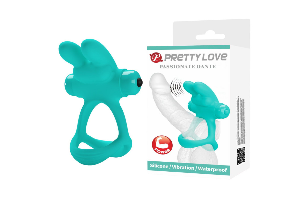 Бирюзовое эрекционное виброкольцо Passionate Dante. С подхватом мошонки и клиторальным зайчиком для ублажения партнёрши. Внутренний диаметр кольца - 3,3 см.