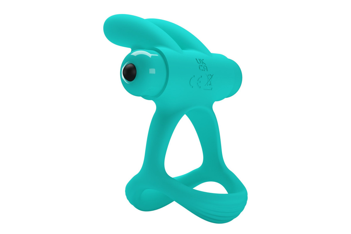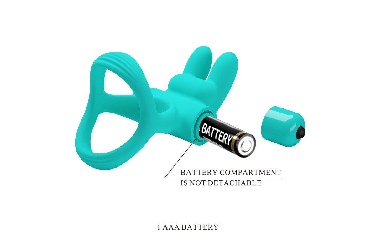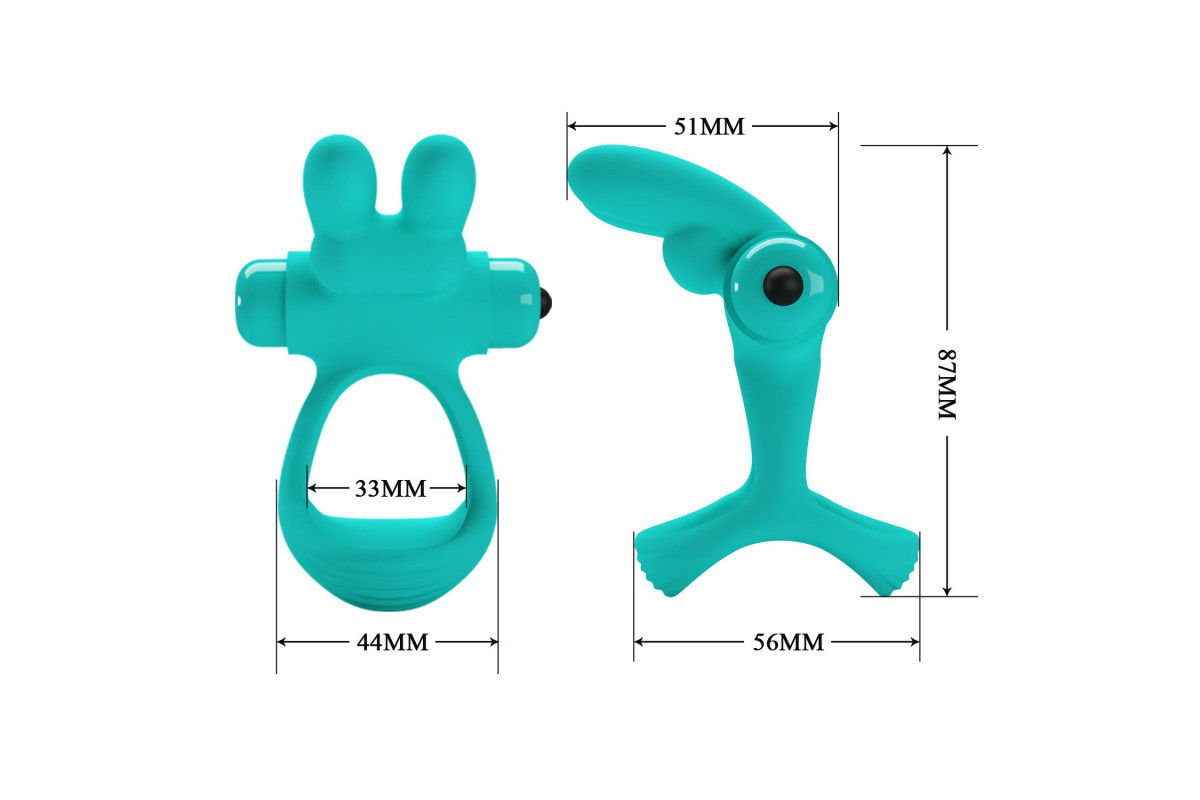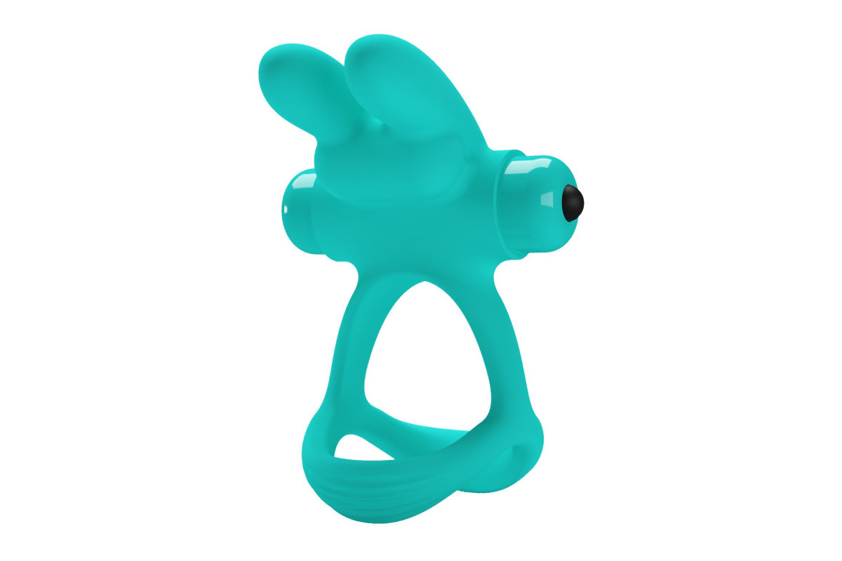 Бирюзовое эрекционное виброкольцо Passionate Dante. С подхватом мошонки и клиторальным зайчиком для ублажения партнёрши. Внутренний диаметр кольца - 3,3 см.