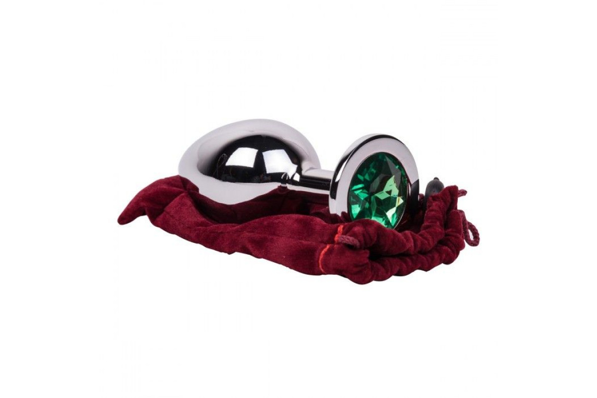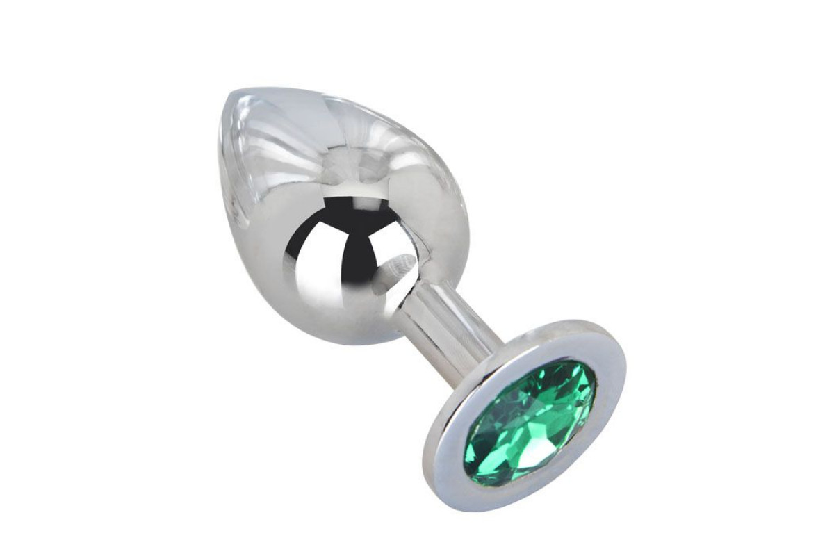 Гладкий большой плаг из отполированной до блеска стали с кристаллом яркого зеленого цвета в основании. Металл - материал с большой теплопроводностью, сначала он будет прохладным, но быстро нагреется до температуры вашего тела. Стальные игрушки можно нагревать или охлаждать с помощью воды.
