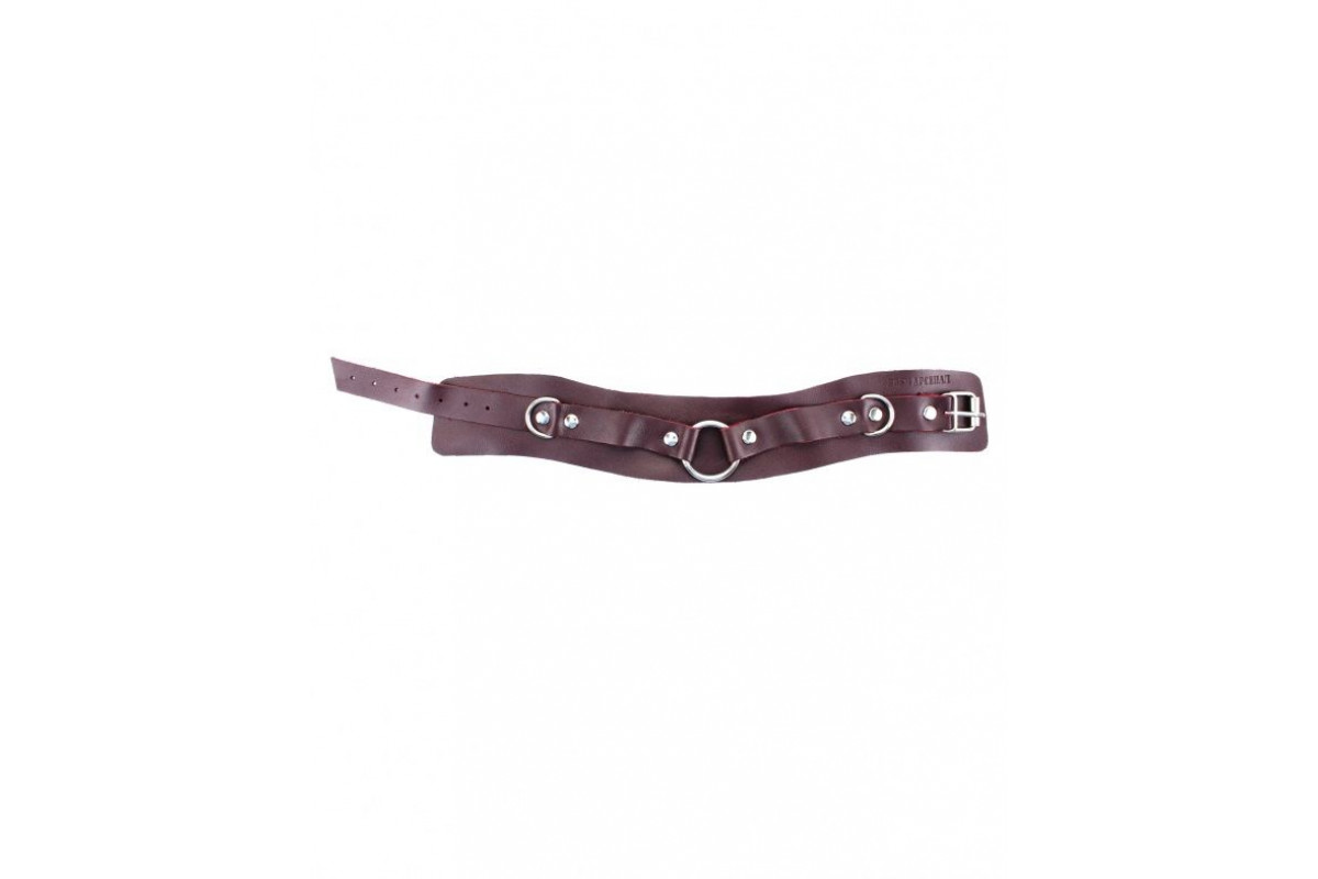 Ошейник сделан из мягкой натуральной кожи бордового цвета. Впереди высокая стойка декорирована металлическим кольцом. Размер ошейника регулируется пряжкой сзади, подойдет на обхват от 30 до 40 см. Стильный аксессуар разнообразит любую БДСМ игру! Диаметр кольца - 3,5 см.