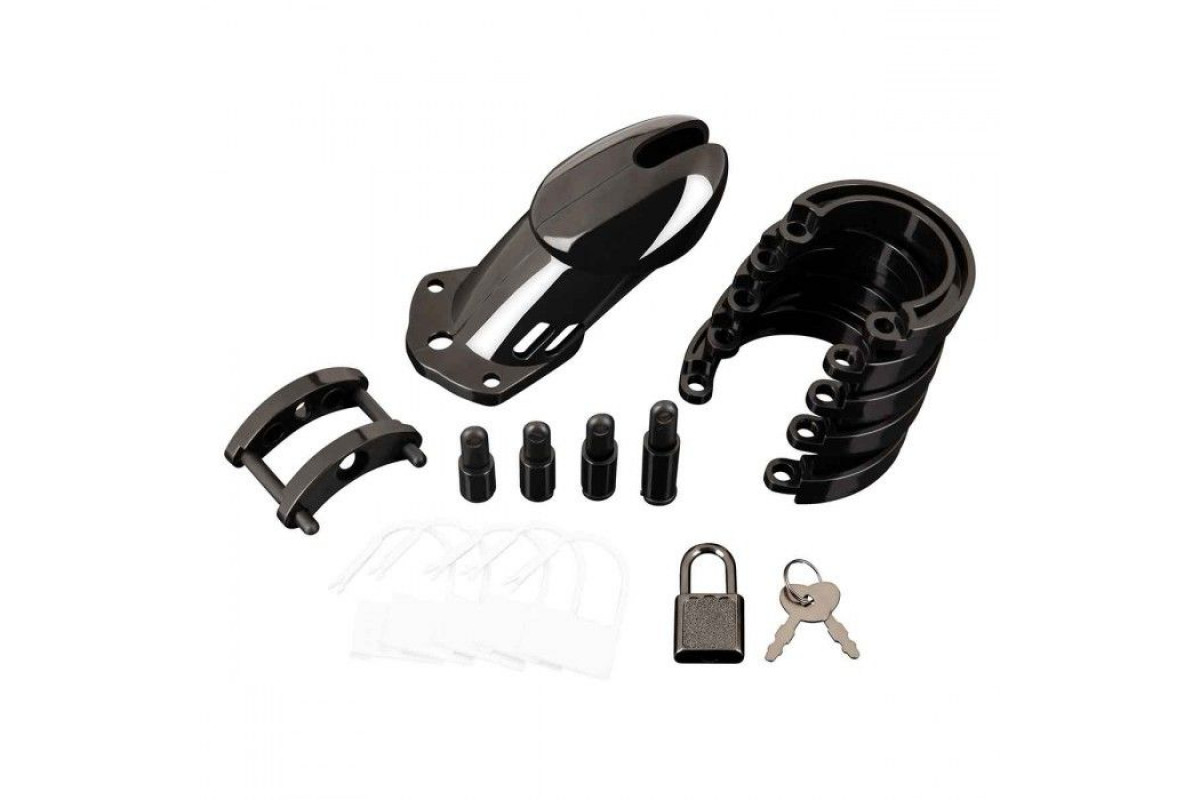 Кольца состоят из трех соединяющихся друг с другом частей. Два направляющих штифта удерживают вместе верхние части. Кольца разных размеров входящие в каждую упаковку, позволяют подобрать нужную посадку. Не позволяет прикасаться к своим гениталиям для получения сексуального удовольствия и дает держателю ключа возможность контролировать сексуальное возбуждение. Изготовлена из темного, безопасного для тела материала, предназначена для длительного ношения.