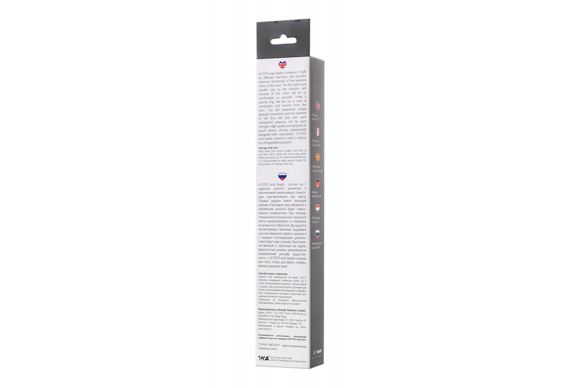 A-toys anal beads - состоит из 7 шариков разного диаметра и обеспечивает интенсивную стимуляцию чувствительных зон ануса. Первые шарики имеют меньший размер, благодаря чему введение и извлечение цепочки будет максимально комфортным. При помощи специального кольца секс-игрушкой легко манипулировать и извлекать из анального отверстия. Вы ощутите неповторимые приятные ощущения уже при введении первого звена и с каждым последующим удовольствие будет еще сильнее. Высококачественный и приятный на ощупь бархатистый силикон, анатомически продуманный рельеф, водостойкость — A-toys anal beads создан для того, чтобы доставить незабываемое удовольствие! Рабочая длина - 26,3 см.