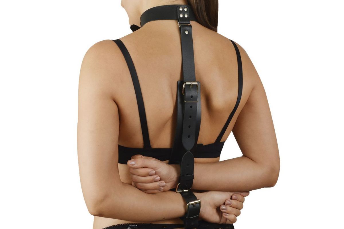 Черная кожаная фиксация рук за спиной — идеальный аксессуар для начинающих