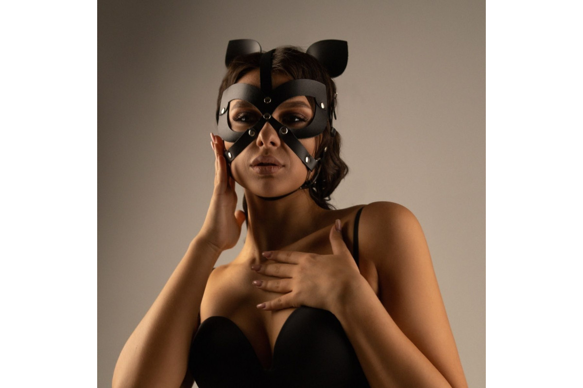 Черная кожаная маска-шлем с маленькими ушками — стильное и загадочное украшение для взрослых