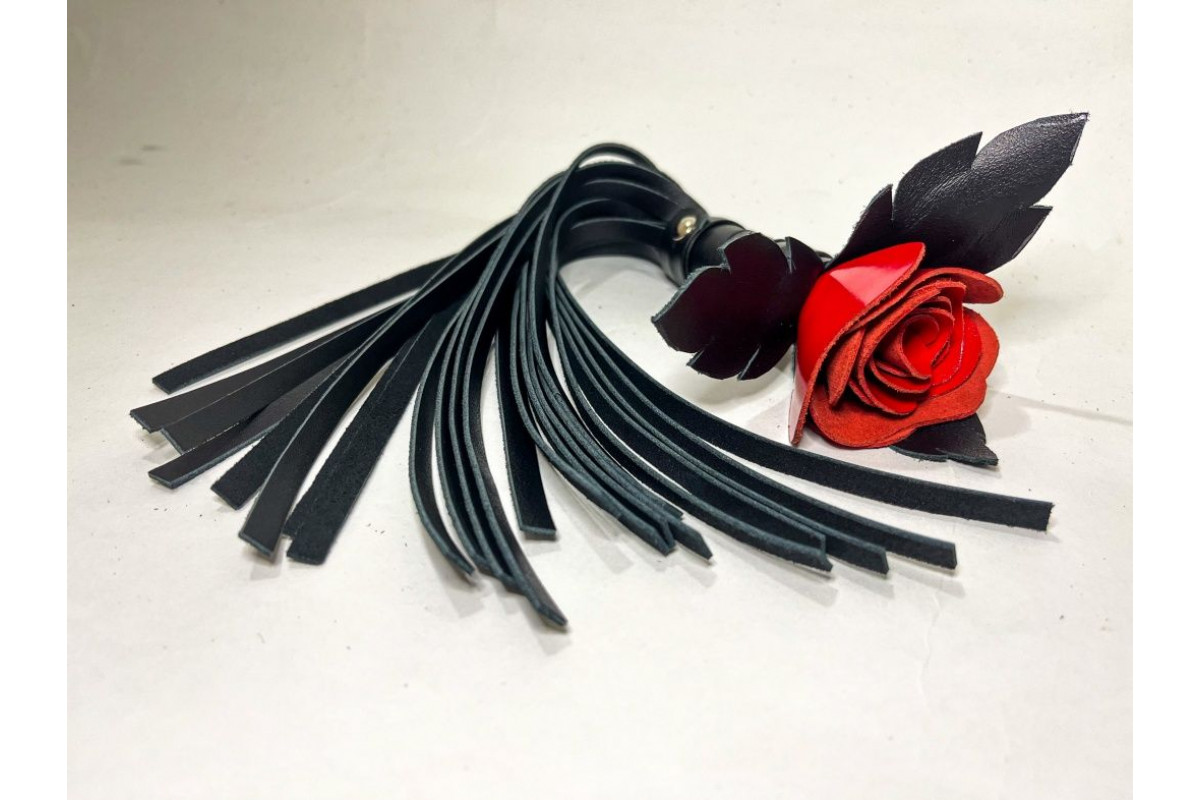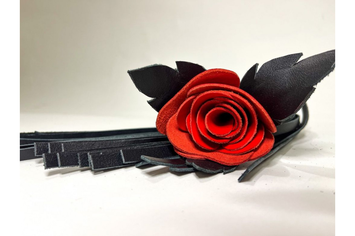 Эта плеть отличается не только своей функциональностью, но и изысканным внешним видом. Черная кожа и яркая красная лаковая роза в рукояти создают эффектный контраст, подчеркивая индивидуальность владельца. Размер 40 см обеспечивает комфортное использование и точное управление при осуществлении любых техник.
