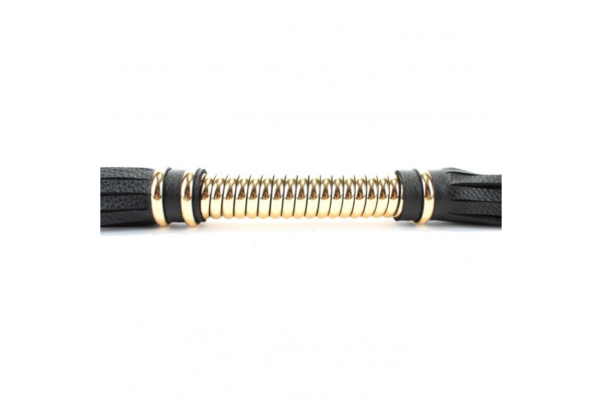 Элегантная чёрная кожаная плетка с золотистой рукоятью – для изысканных наслаждений