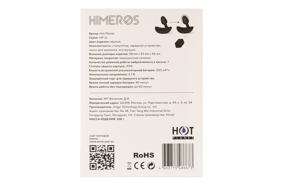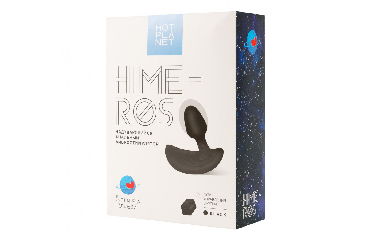 Himeros — небольшая анальная пробка с функцией надува и дистанционным управлением. В Himeros встроены два мощных мотора: первый расположен в рельефном кончике, а второй надувает пробку до 4.6 см в диаметре. Эти функции можно комбинировать, а можно использовать по отдельности, наслаждаясь вибрацией и ощущением наполненности по своему выбору.