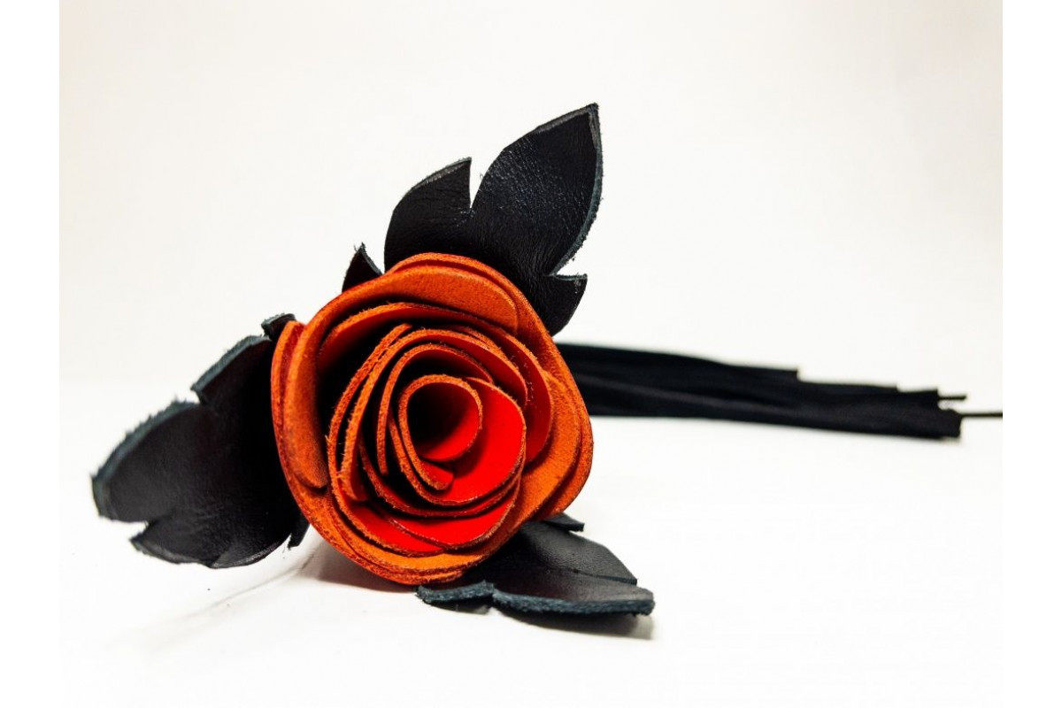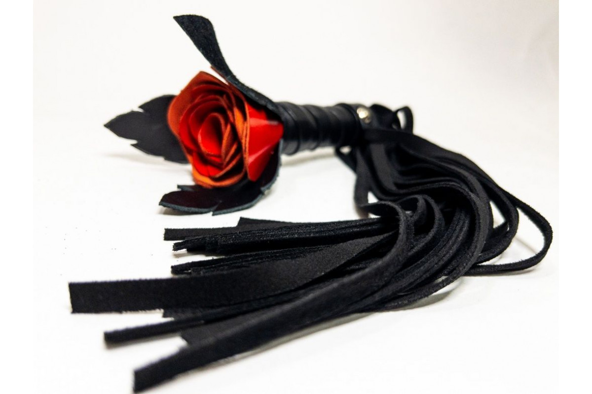 Восхитительная мини-плеть, украшенная красной розой. Цветок полностью выполнен из натуральной лаковой кожи, листочки розы и рукоятка выполнены из мягкой натуральной кожи, а хвосты плети - натуральная мягкая замша. Размеры этой плети очень изящны, поэтому данную плеть можно использовать, как генитальную, чтобы добавить новых ярких ощущений. Розочка очень удобно лежит в руке и создает неповторимую атмосферу и настроение, этот аксессуар никого не оставит равнодушным!