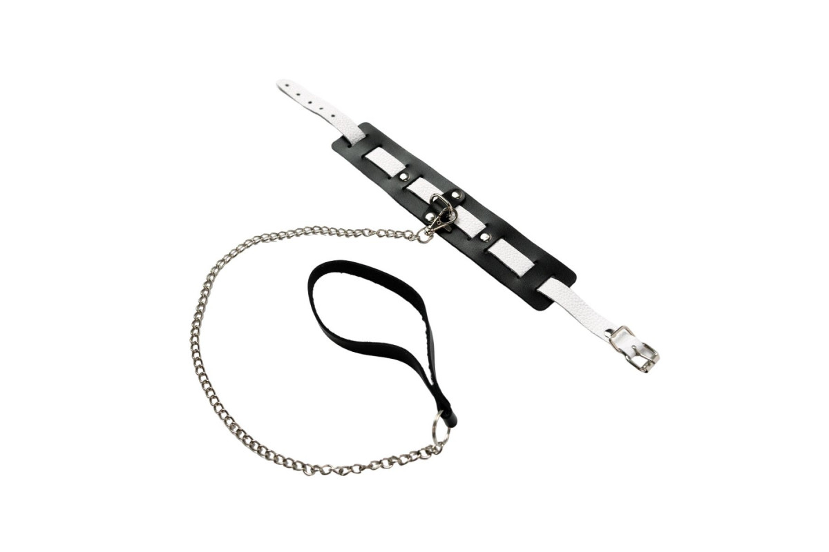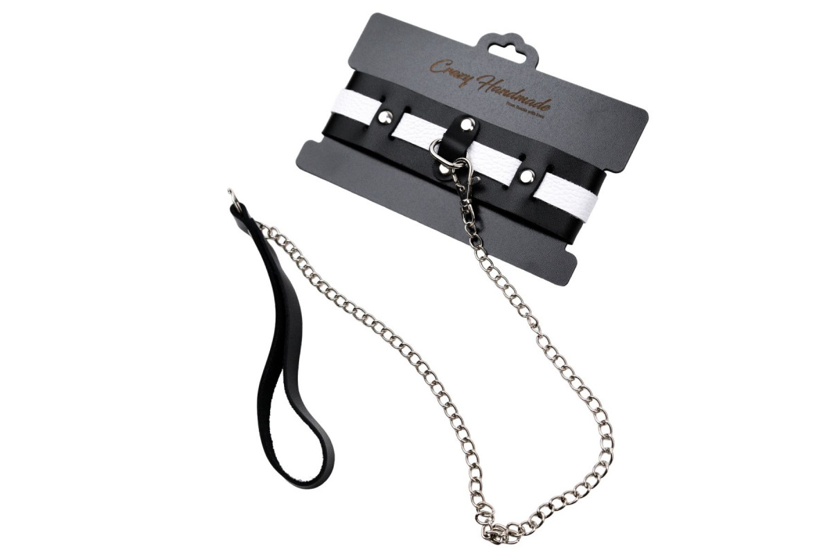 Черно-белый кожаный ошейник с поводком-цепочкой — стильное и элегантное решение для взрослых