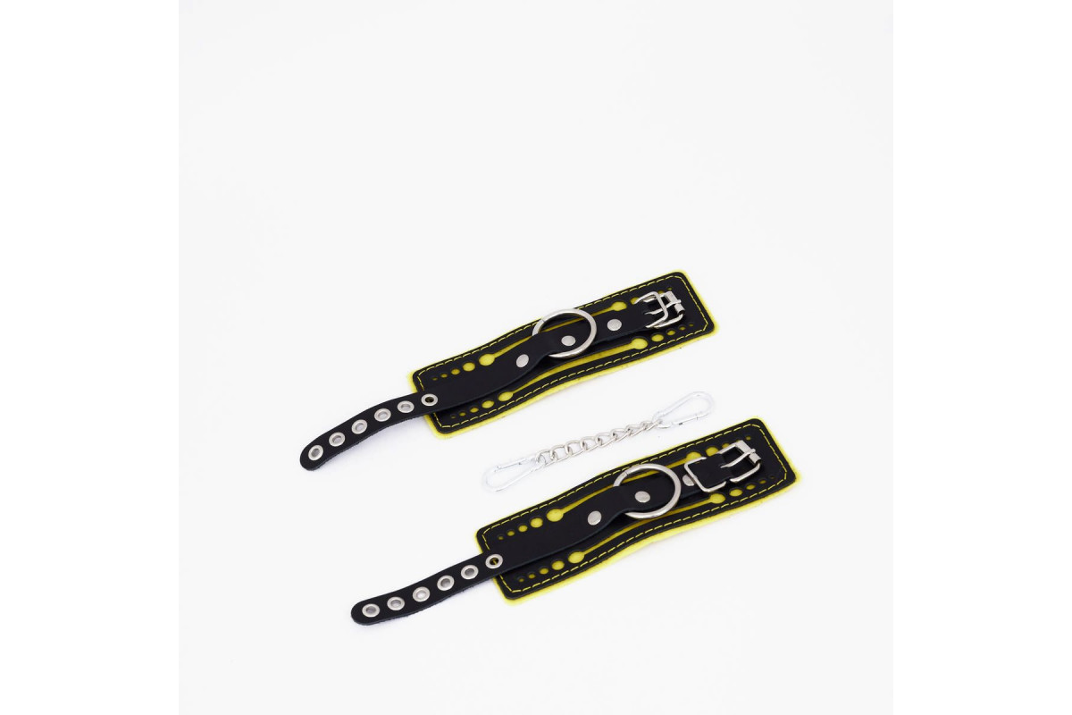 Черно-желтые кожаные наручники с жёлтой строчкой — стильное и элегантное дополнение для взрослых игр