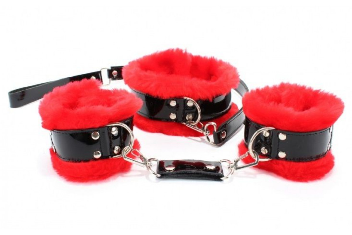 Добавьте в свою коллекцию этот стильный и функциональный комплект черно-красных меховых наручников и ошейника с поводком и откройте новые горизонты наслаждения и удовольствия!
