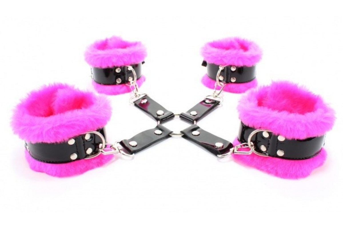Черно-розовая крестообразная меховая фиксация для рук и ног