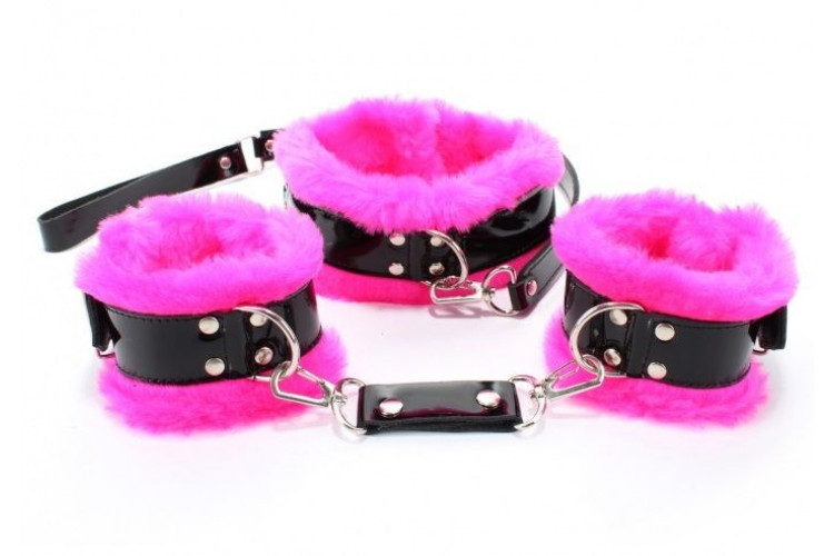 Черно-розовые меховые наручники и ошейник с поводком — подчеркните свою страсть и стиль