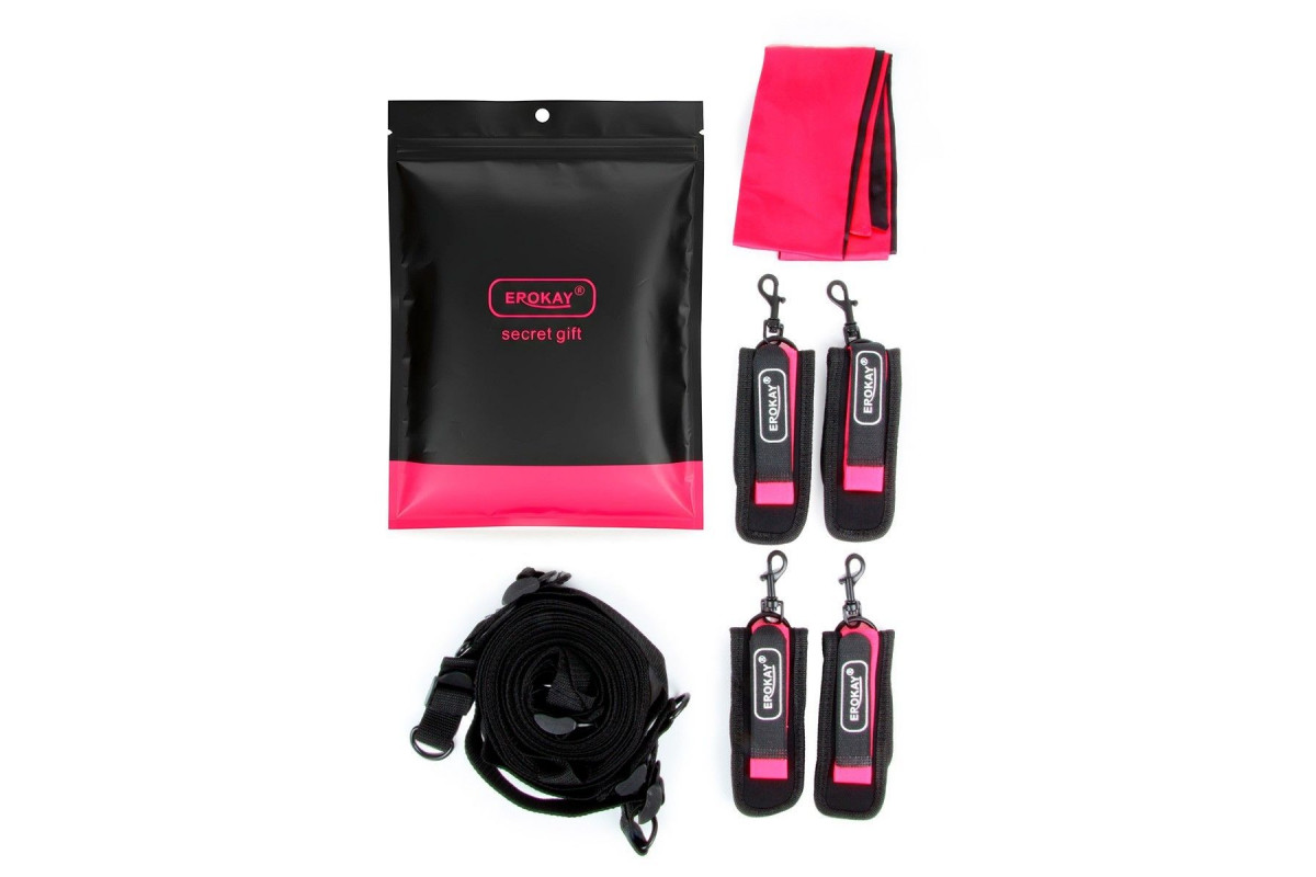 Черно-розовый эротический набор: фиксатор, оковы, наручники, повязка
