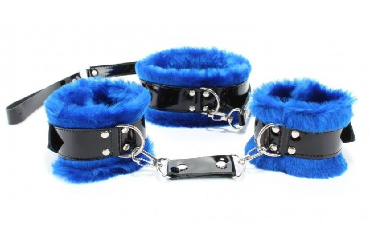 Черно-синие меховые наручники и ошейник с поводком — идеальный аксессуар для взрослых