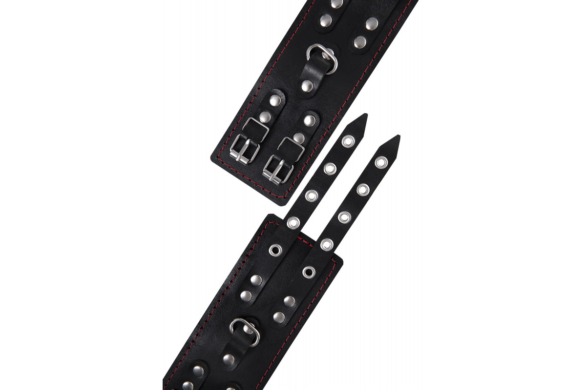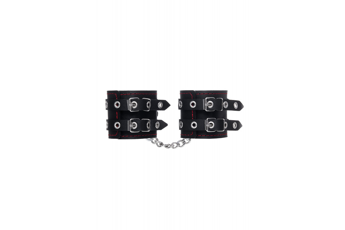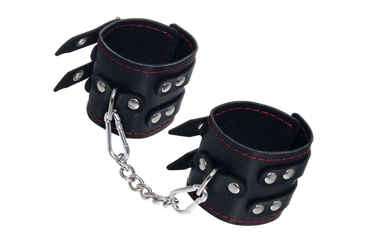 Черные кожаные наручники с двумя ремнями и контрастной строчкой — стильное и надежное решение для ваших интимных игр