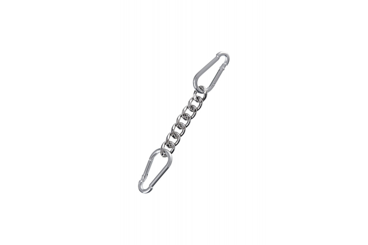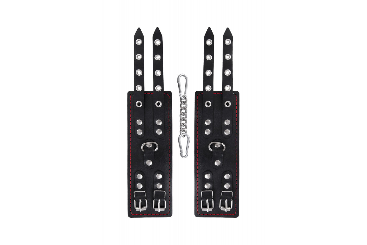 Наличие двух колец и карабинов, соединенных между собой металлической цепочкой, позволяет использовать изделие как раздельно – аксессуар-манжеты, так и как наручники для фиксации. К широким металлическим кольцам также можно присоединить и другие аксессуары при помощи карабинов.