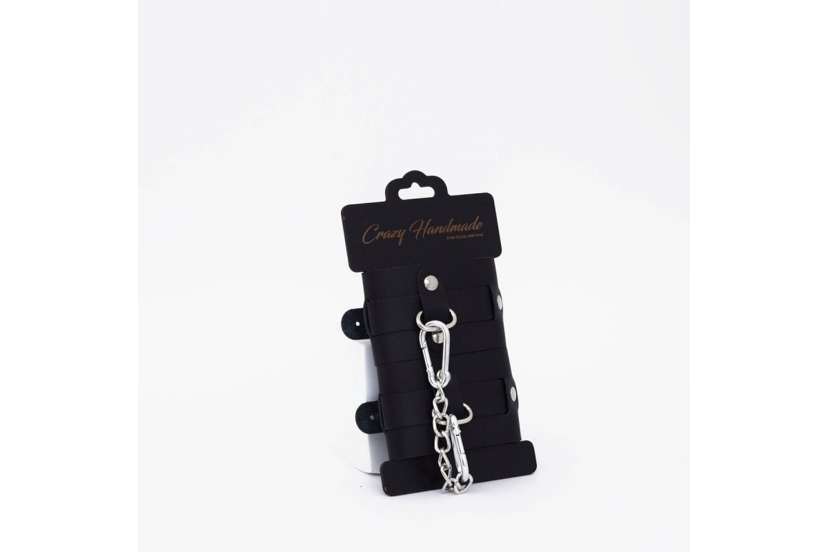 Изделие состоит из двух деталей: основа прямоугольной формы из натуральной кожи черного цвета и ремешок с прочной хромированной фурнитурой в виде овального кольца . Расположение ремешка через прорези основной части не только является стильным декоративным решением, но и служит для точной регулировки размера, обеспечивая идеальную посадку (от 15 до 22 см).