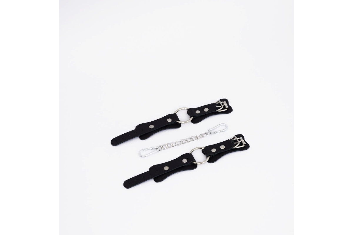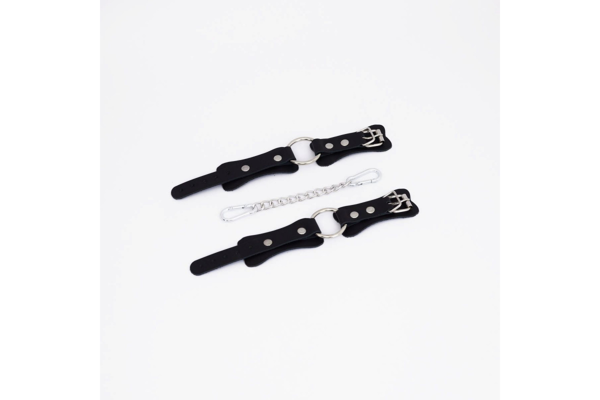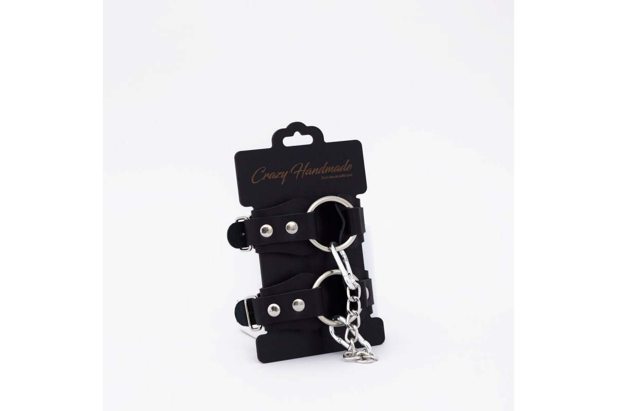 Изделие состоит из двух ремешков из натуральной кожи , соединенных посередине. Их лаконичный дизайн позволяет использовать их не только для фиксации рук в любовных играх, но и как модный аксессуар, который украсит ваш повседневный или вечерний образ. В комплект входит стальное кольцо и соединительный элемент в виде прочной цепочки с двумя надежными карабинами , которые обеспечивают стабильность и контроль.