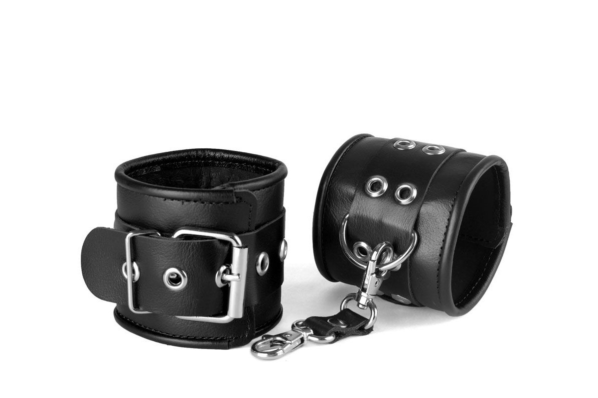 Черные кожаные наручники с ремешком и двумя карабинами — идеальный аксессуар для взрослых