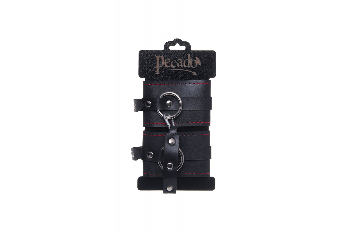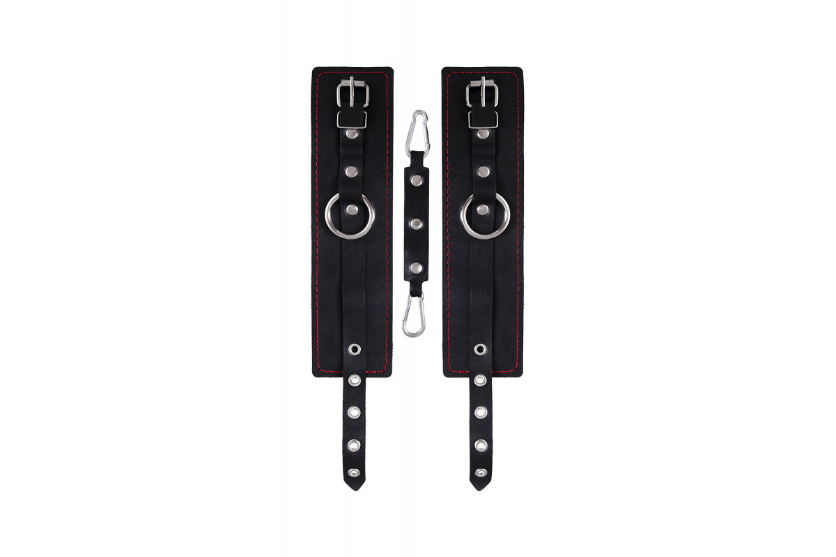 Наличие двух колец и карабинов, соединенных между собой кожаным ремешком, позволяет использовать изделие как раздельно – аксессуар-манжеты, так и как оковы для фиксации. К широким металлическим кольцам также можно присоединить и другие аксессуары при помощи карабинов.