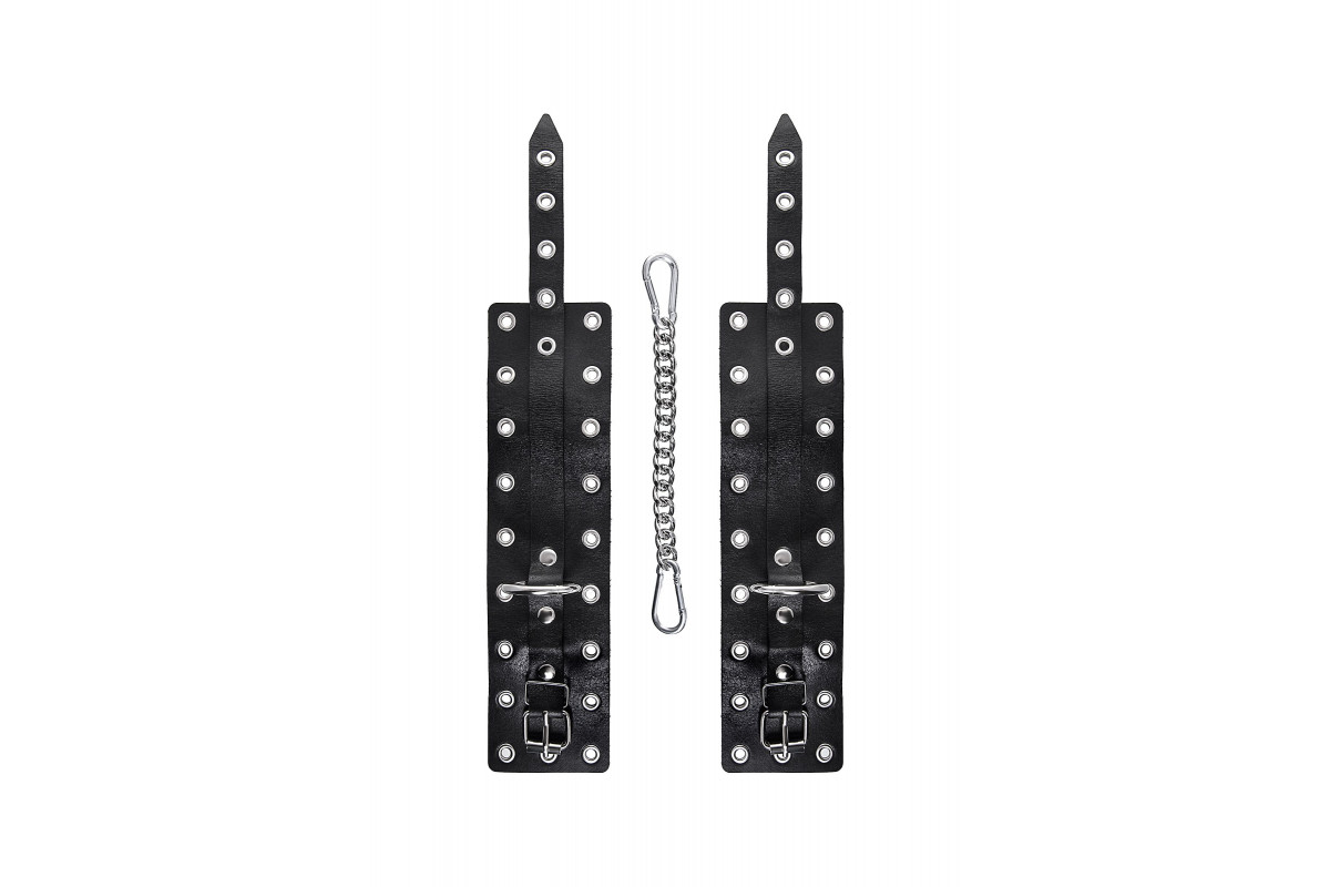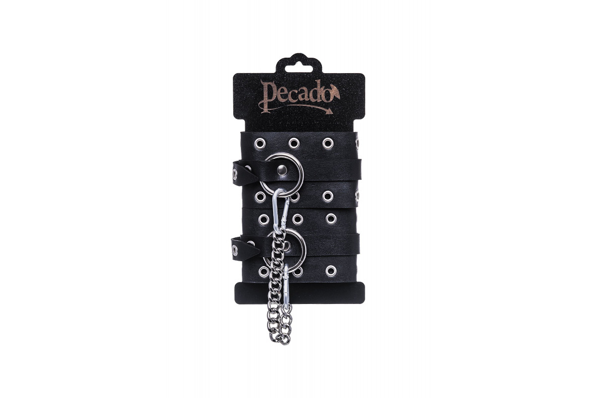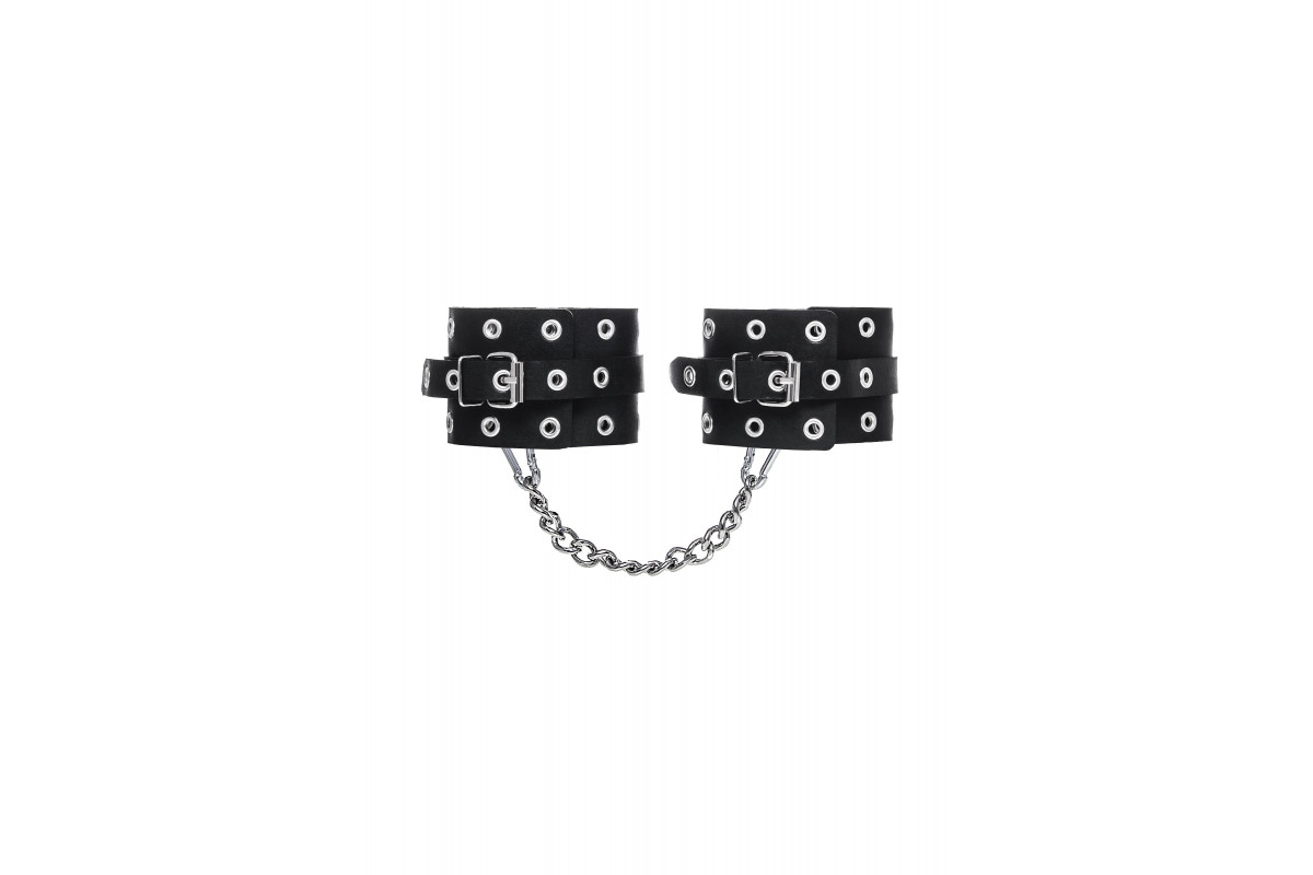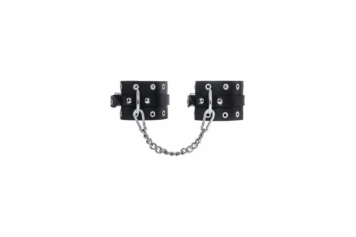 Наличие двух колец и карабинов, соединенных между собой кожаным ремешком, позволяет использовать изделие как раздельно – аксессуар-манжеты, так и как оковы для фиксации. К широким металлическим кольцам также можно присоединить и другие аксессуары при помощи карабинов.