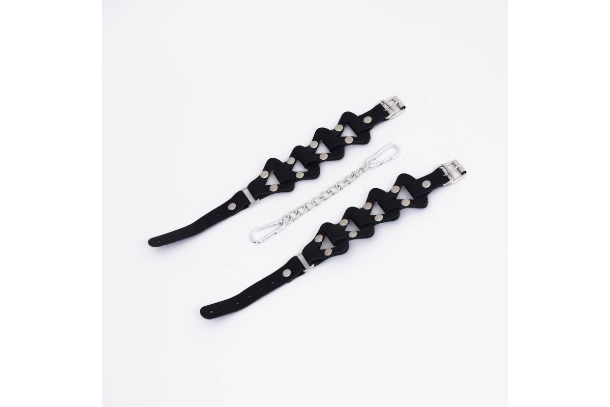 Изделие выполнено из мягких кожаных ремешков , которые комфортно облегают запястья или щиколотки, обеспечивая удобство даже при длительном использовании. Треугольная цепь плетения добавляет изделию элегантности и эротичности, подчеркивая красоту вашего тела. Минималистичный дизайн позволяет использовать их не только для фиксации в любовных играх, но и как стильный аксессуар, который украсит ваш повседневный или вечерний образ.
