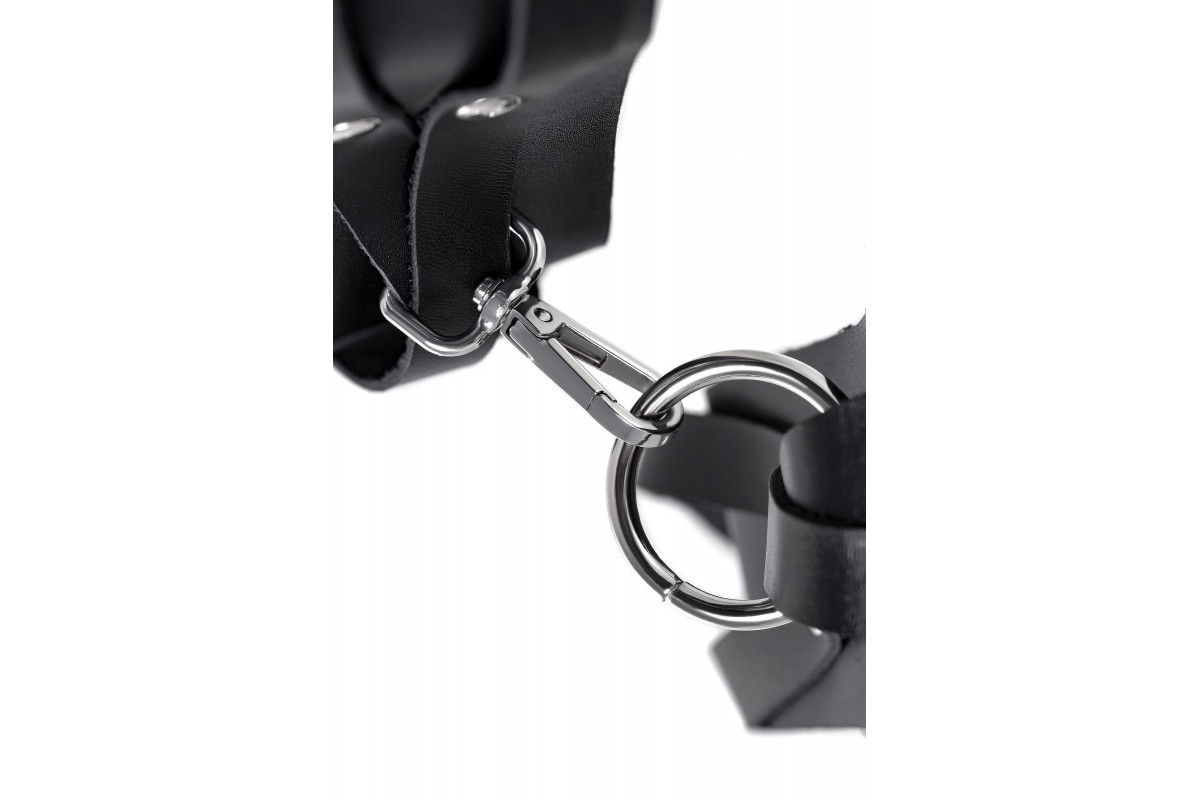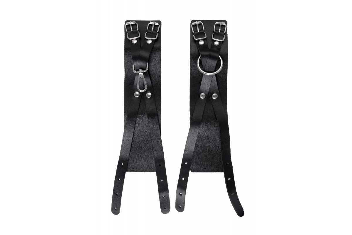 Черные кожаные оковы с двумя перекрёстными ремешками — идеальный аксессуар для интимных игр