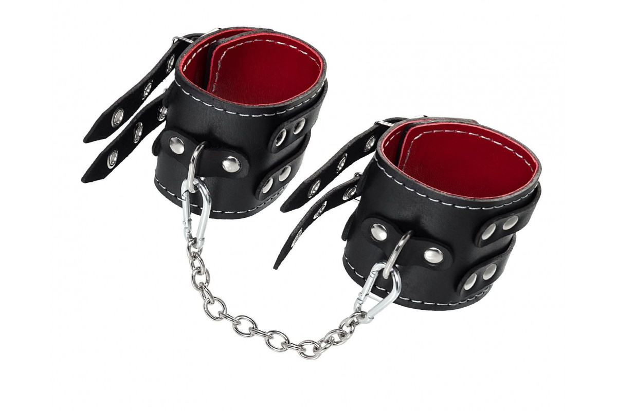 Черные кожаные оковы с двумя ремнями и красной подкладкой — добавьте страсти в ваши интимные игры