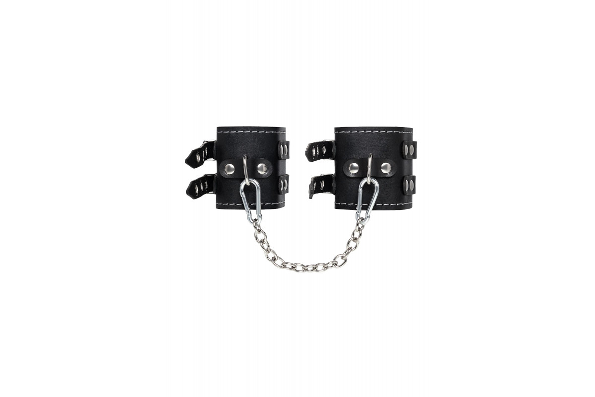 Наличие двух колец и карабинов, соединенных между собой металлической цепочкой, позволяет использовать изделие как раздельно – аксессуар-манжеты, так и как оковы для фиксации. К широким металлическим кольцам также можно присоединить и другие аксессуары при помощи карабинов.