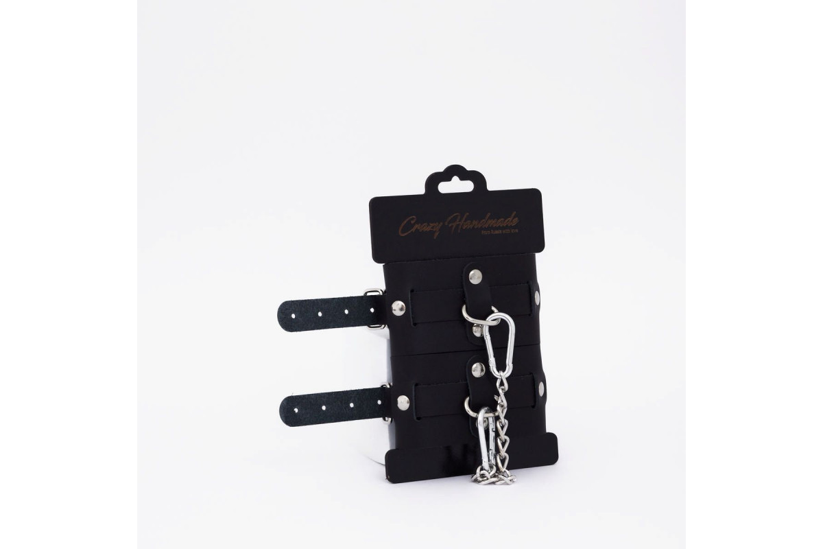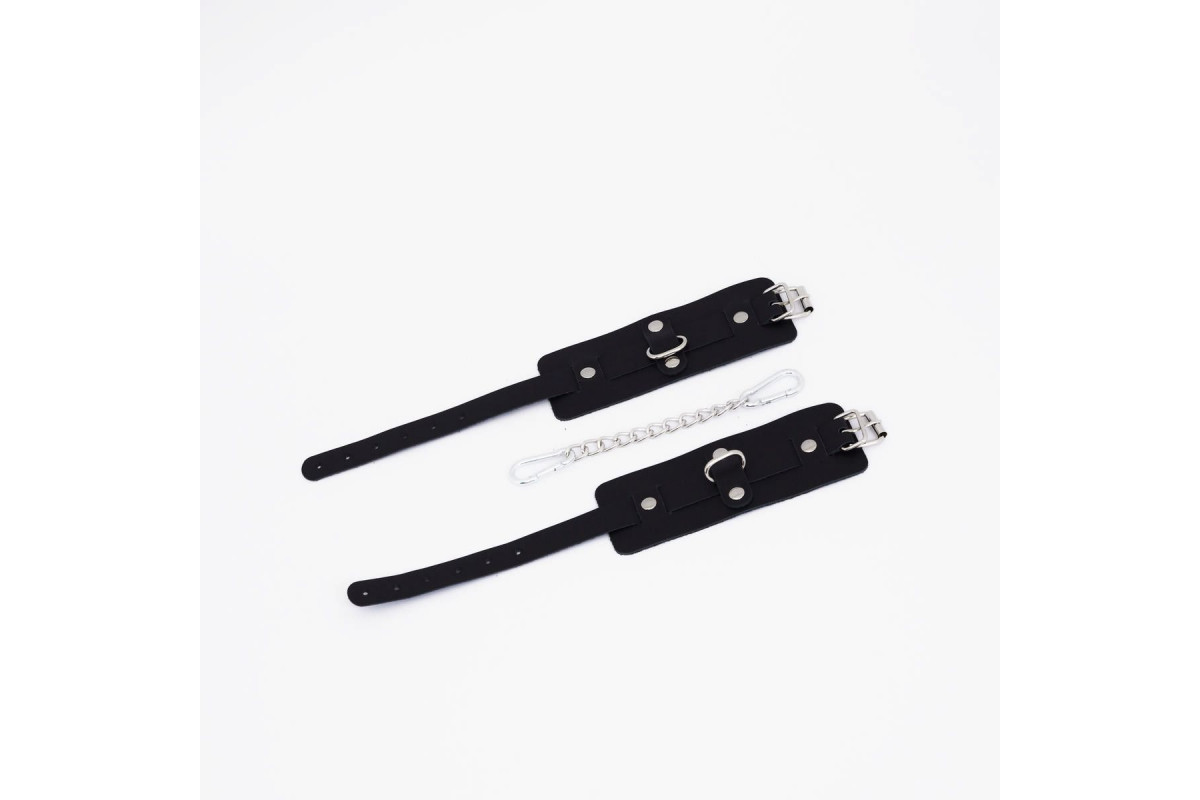 Каждый элемент создан с вниманием к деталям, что обеспечивает не только эстетическую привлекательность, но и безопасность. Наши черные кожаные оковы с хромированной фурнитурой станут незаменимым дополнением вашего интимного арсенала, помогая раскрыть новые грани удовольствия и доверия.