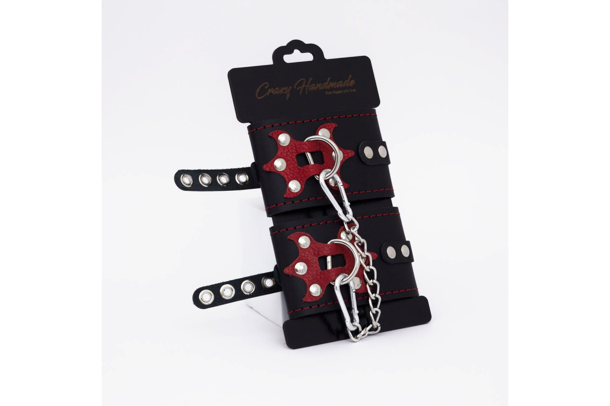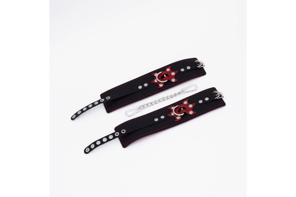 Черные кожаные оковы с красным декором и строчкой — стильное и эффектное дополнение для взрослых игр