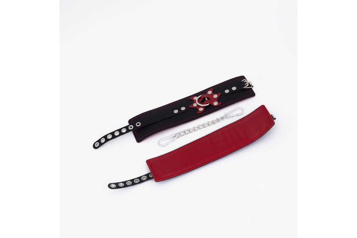 Откройте для себя уникальное сочетание роскоши и дерзости с нашими черными кожаными оковами с ярким красным декором и строчкой. Этот аксессуар создан для тех, кто ценит качество, стиль и безопасность в интимных развлечениях.