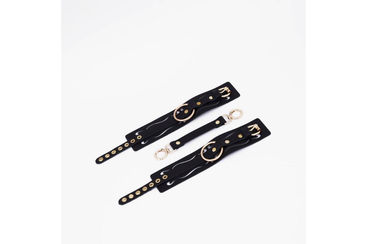 Черные кожаные оковы с золотистой фурнитурой — идеальный аксессуар для взрослых