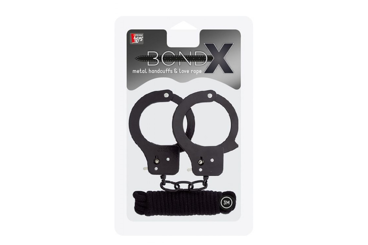 Чёрные наручники из листового металла в комплекте с верёвкой – BONDX METAL CUFFS & LOVE ROPE SET