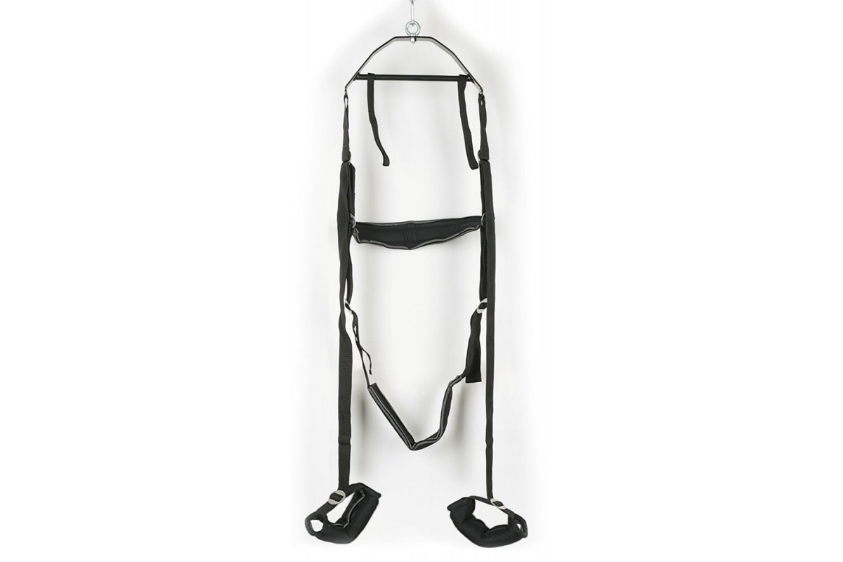 Черные секс-качели из широких ремней. Ремни регулируются по длине, чтобы вы могли настроить их для идеального расположения партнера. В комплекте маска на глаза и плеть. Выдерживают вес до 100 кг.