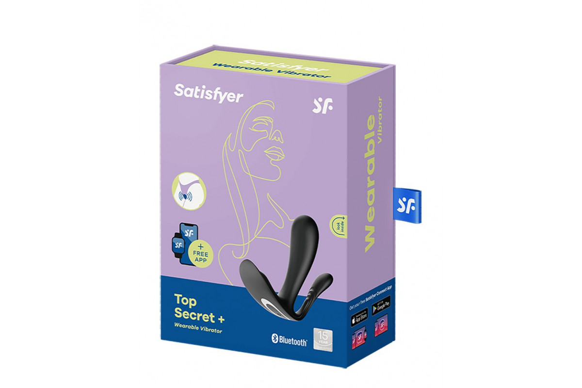 Через Bluetooth Top Secret+ подключается к отмеченному наградами бесплатному приложению Satisfyer Connect, что предоставляет вам возможность независимо управлять двумя моторами и настраивать вибрации на ходу (10 режимов на выбор). Top Secret+ изготовлен из безопасного для тела силикона, работает от аккумулятора и имеет степень водонепроницаемости IPX7. Диаметр отростков - 3 и 1,7 см.