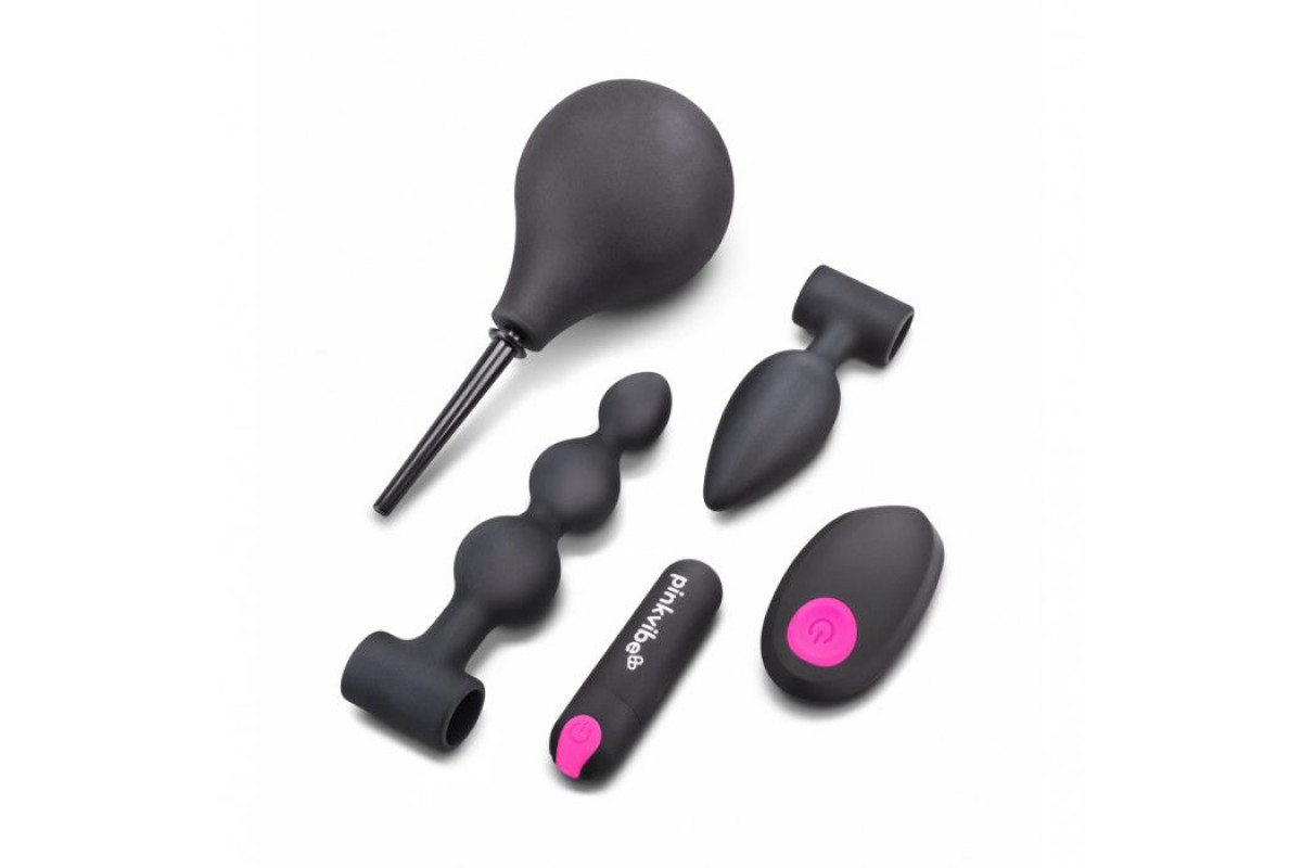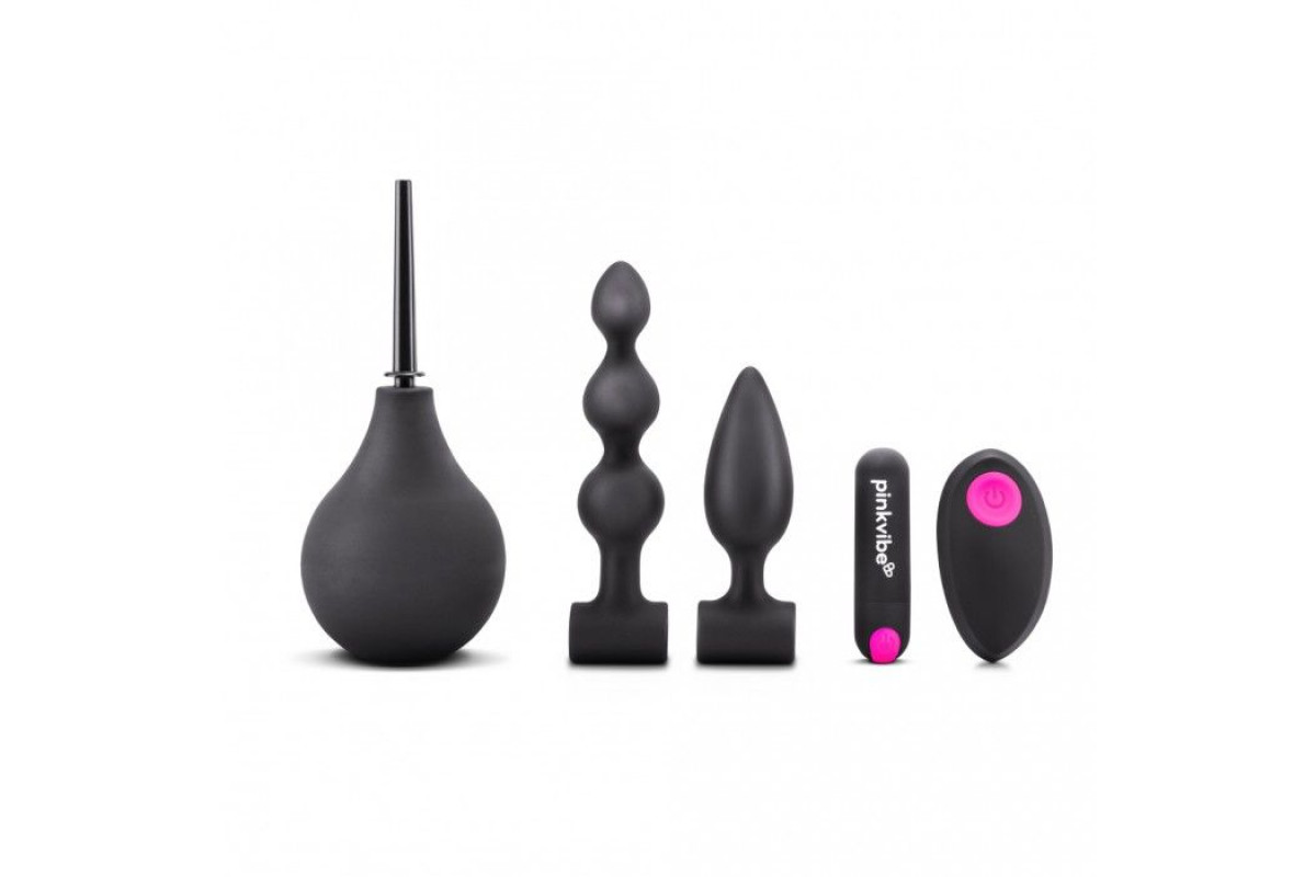 Набор для начинающих, подготавливающий к анальному сексу включает в себя: гигиенический анальный душ, виброэлемент на дистанционном управлении, небольшой силиконовый анальный плаг и анальную елочку из силикона.