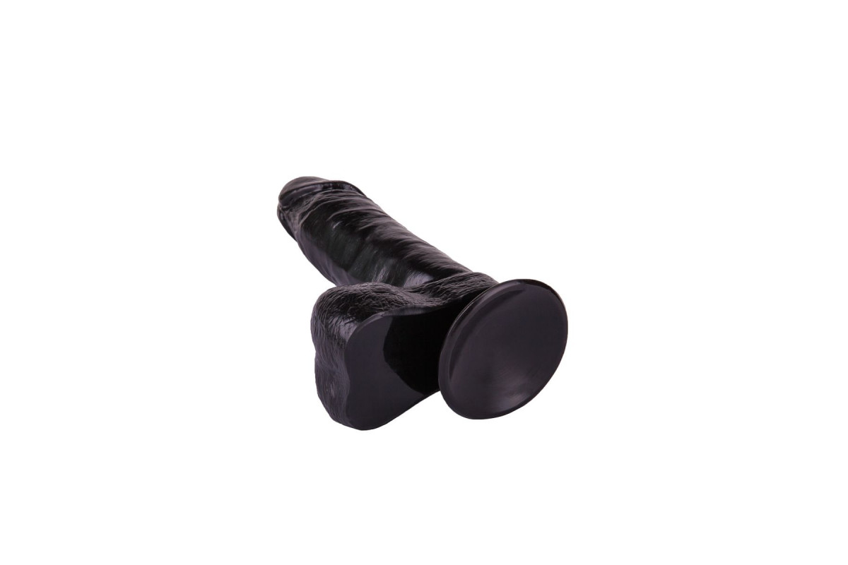 Чёрный фаллоимитатор с мошонкой на присоске - 16 см.