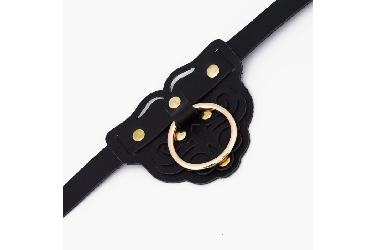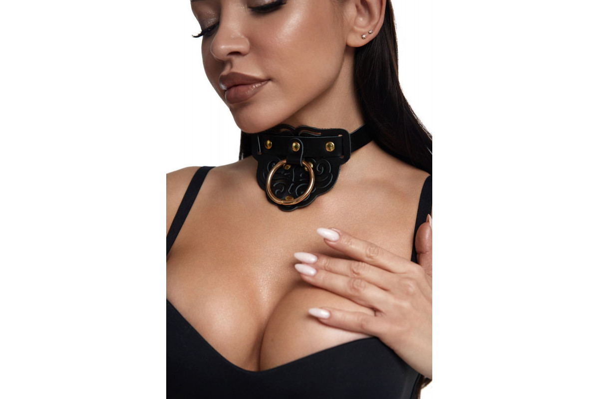 Черный фигурный кожаный ошейник с золотистой фурнитурой — стильное и элегантное украшение для взрослых