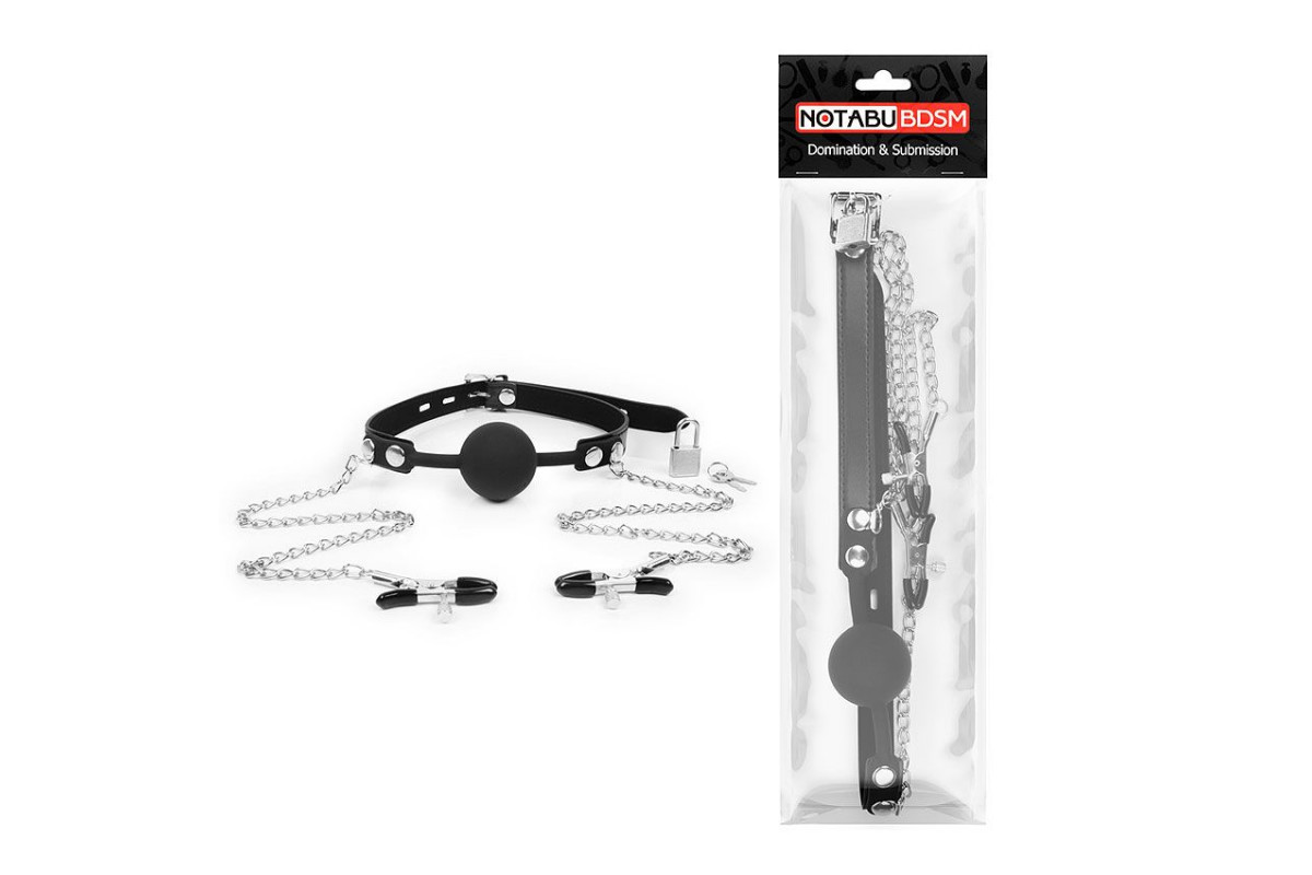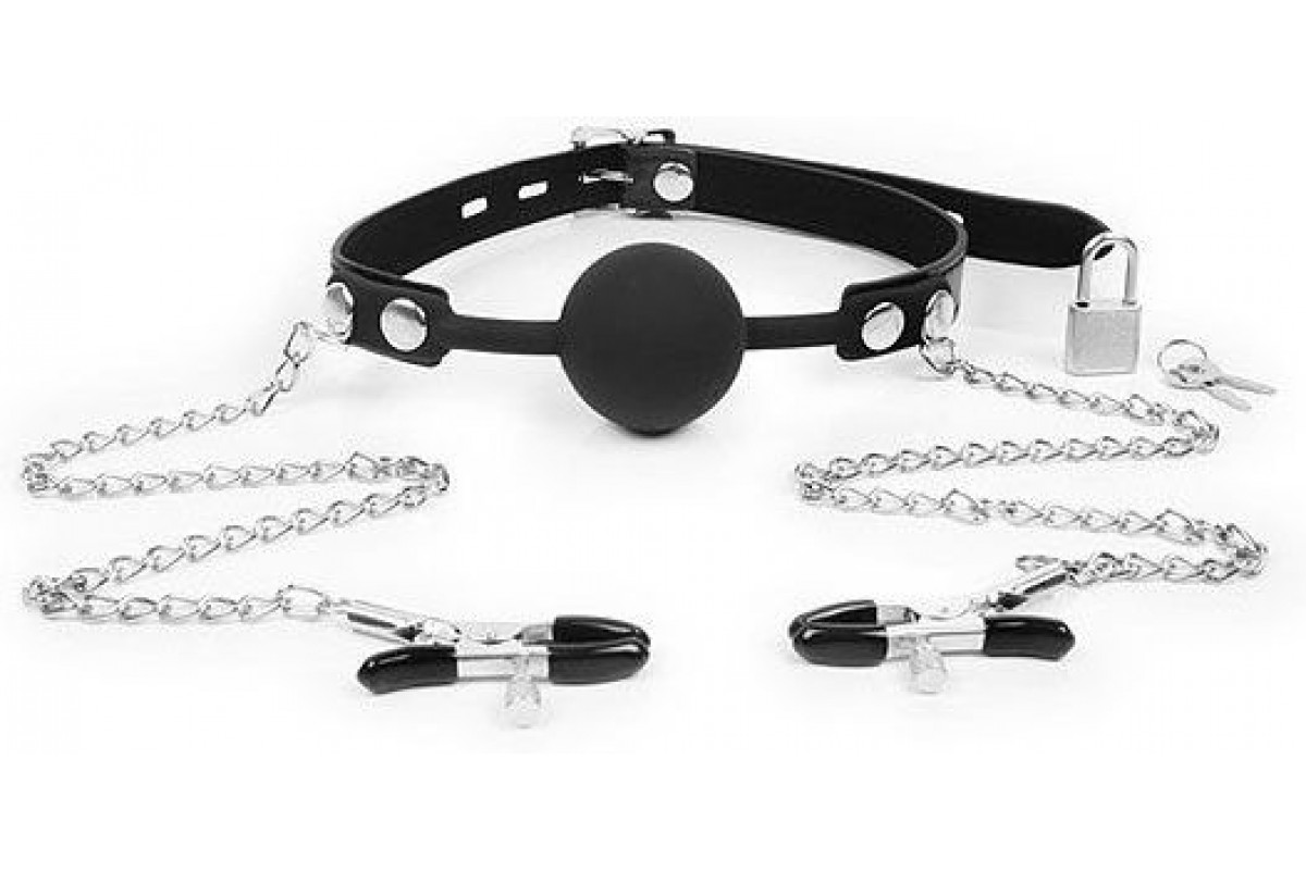 Черный кляп-шарик с зажимами на соски на металлической цепочке
