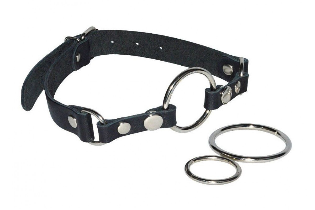 Черный кожаный кляп с 3 сменными кольцами — стильное и функциональное BDSM-устройство