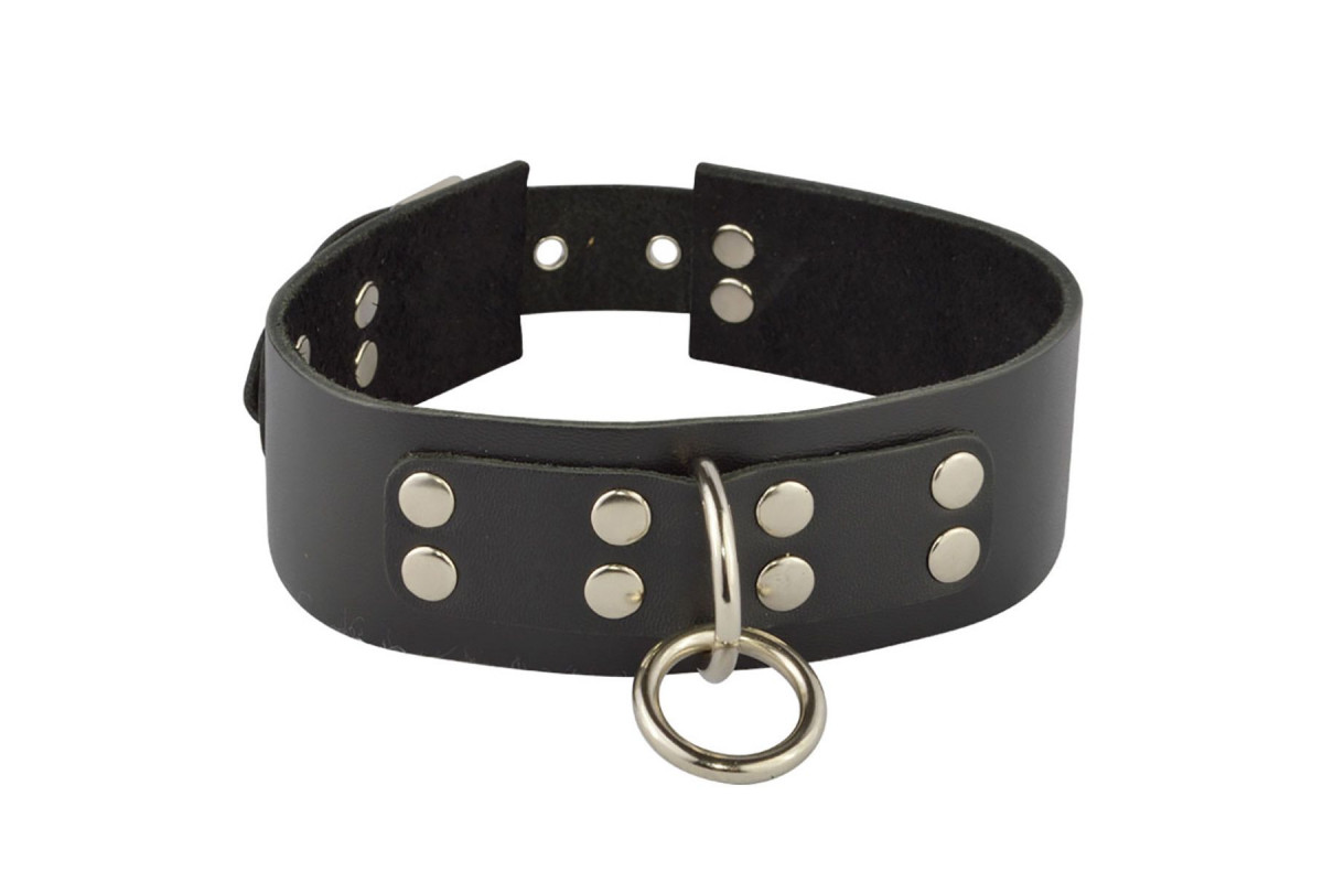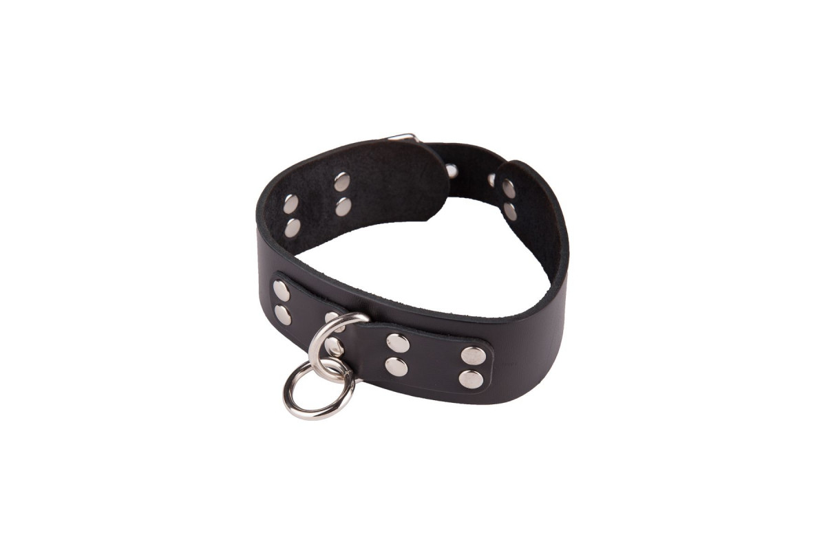 Черный кожаный ошейник с кольцом и клепками — стильный аксессуар для взрослых