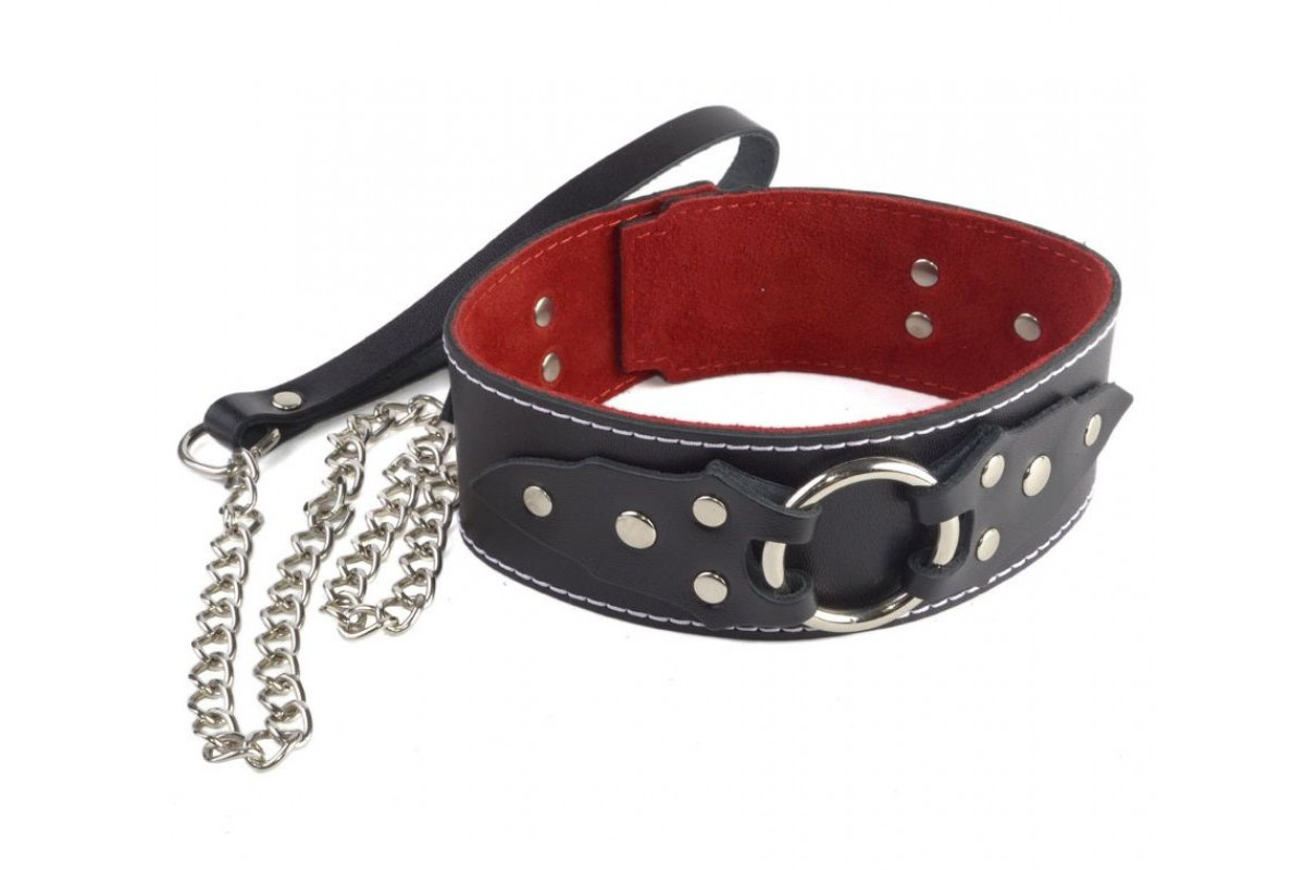 Чёрный кожаный ошейник с красной изнанкой и поводком
