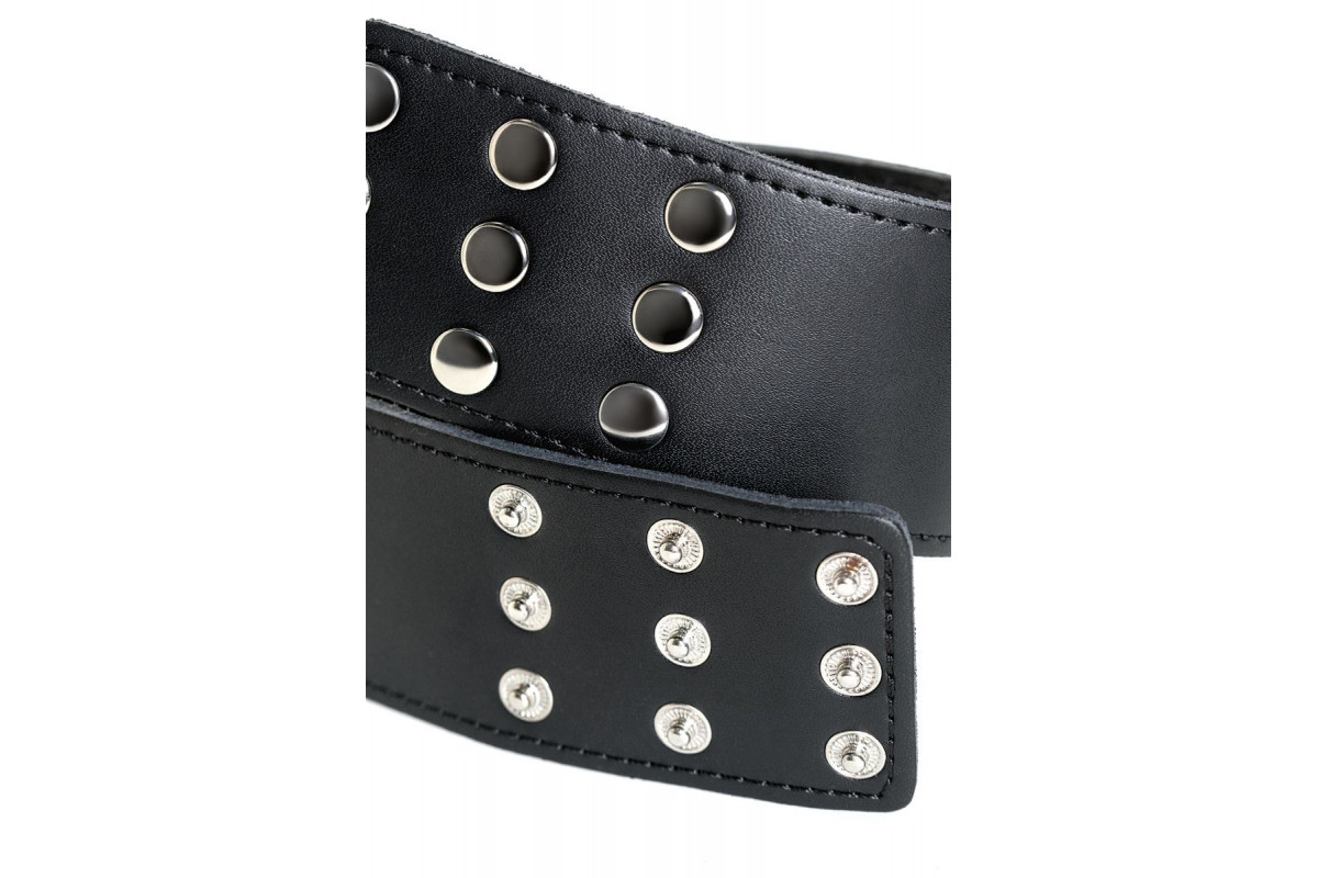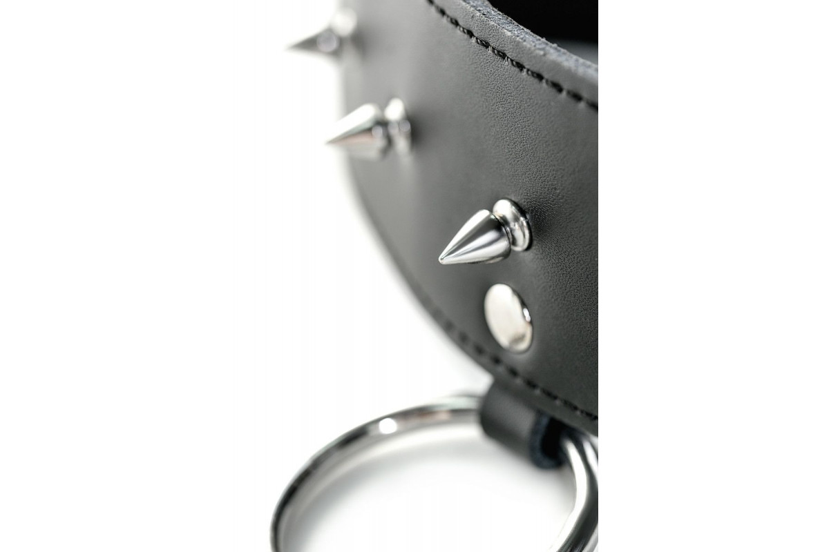 Ошейник выполнен из тщательно обработанной натуральной кожи высокого качества, покрытой чёрной матовой или глянцевой отделкой, подчеркивающей его стиль. Солидность и классика сочетаются с эффектными металлическими шипами, которые выступают как символ силы и вызова. Расположенные равномерно по всему периметру изделия, шипы придают облику агрессивную нотку, не прибегая к чрезмерной жесткости. Такой дизайн сочетает практичность и эстетику, делая аксессуар универсальным и легко сочетаемым с различными элементами гардероба.